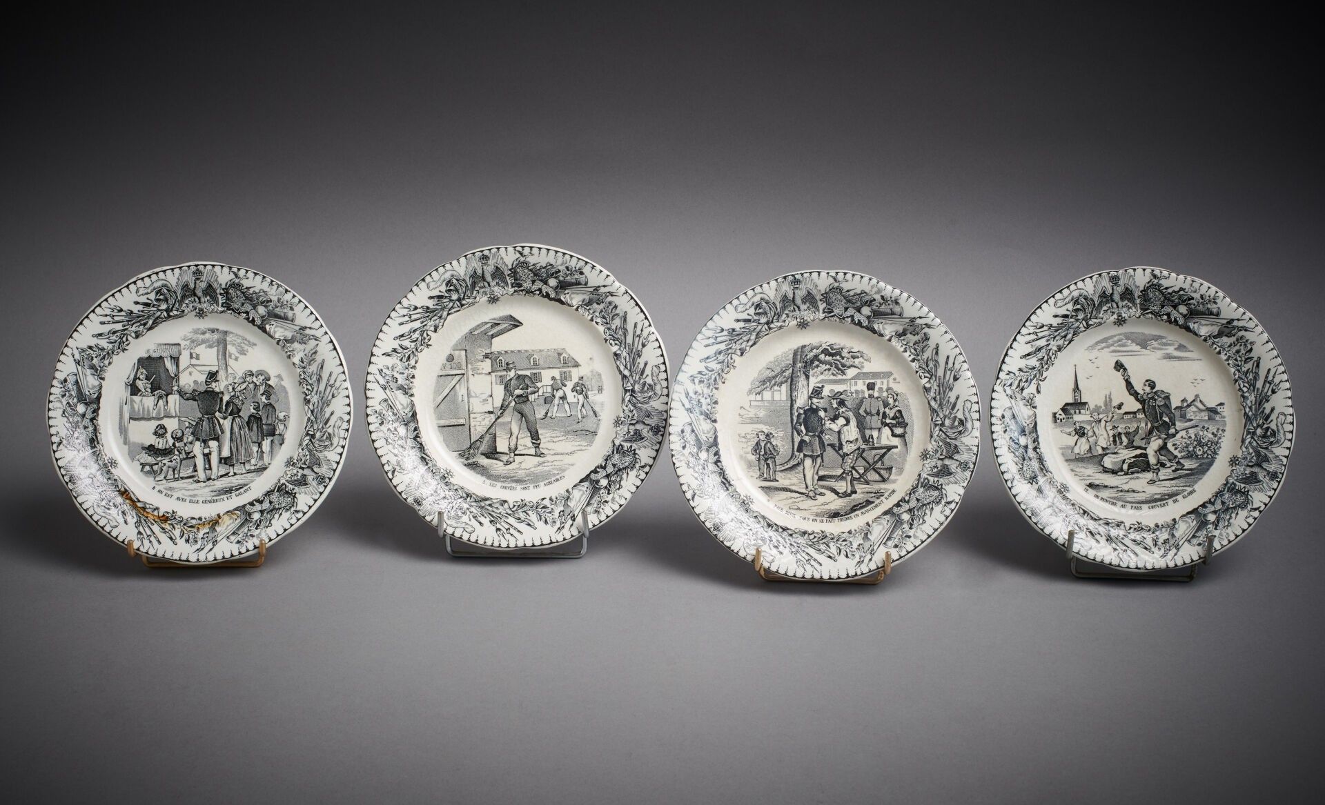 Set of four fine earthenware plates with grisaille decoration on a militaria theme