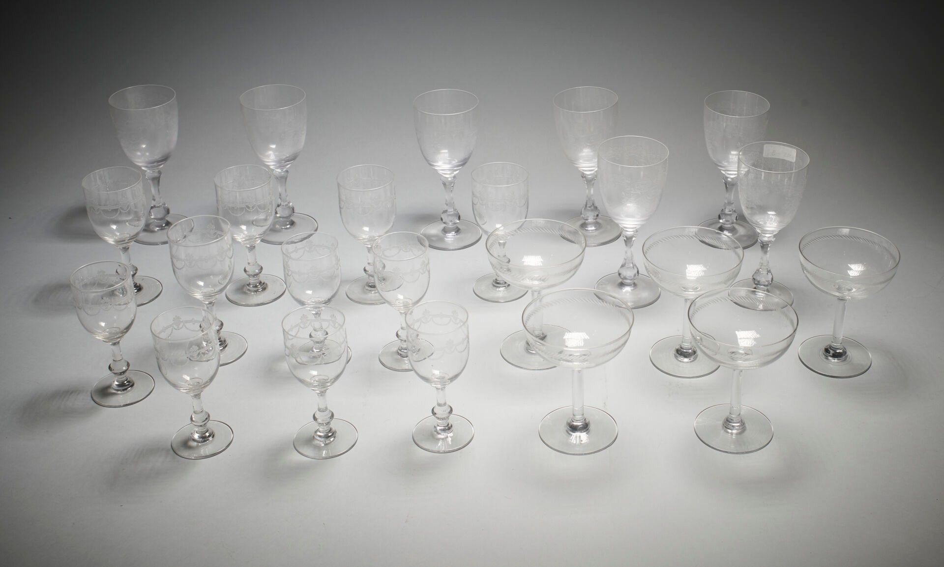 Set of mismatched engraved crystal glasses