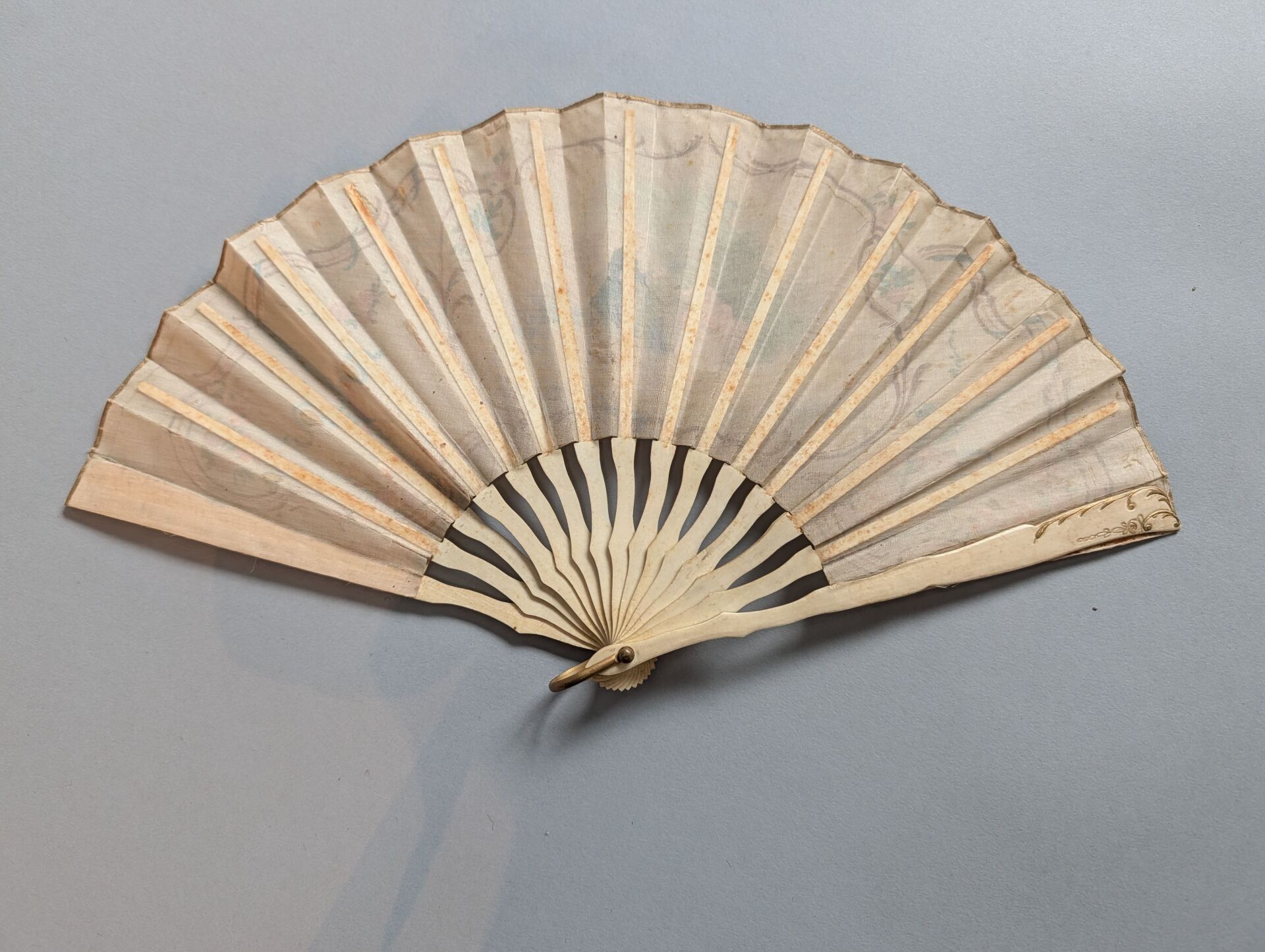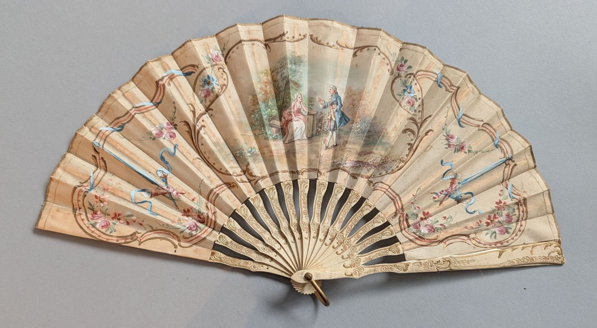 Sixteen-armed bone fan, gouache leaf decorated with a gallant scene