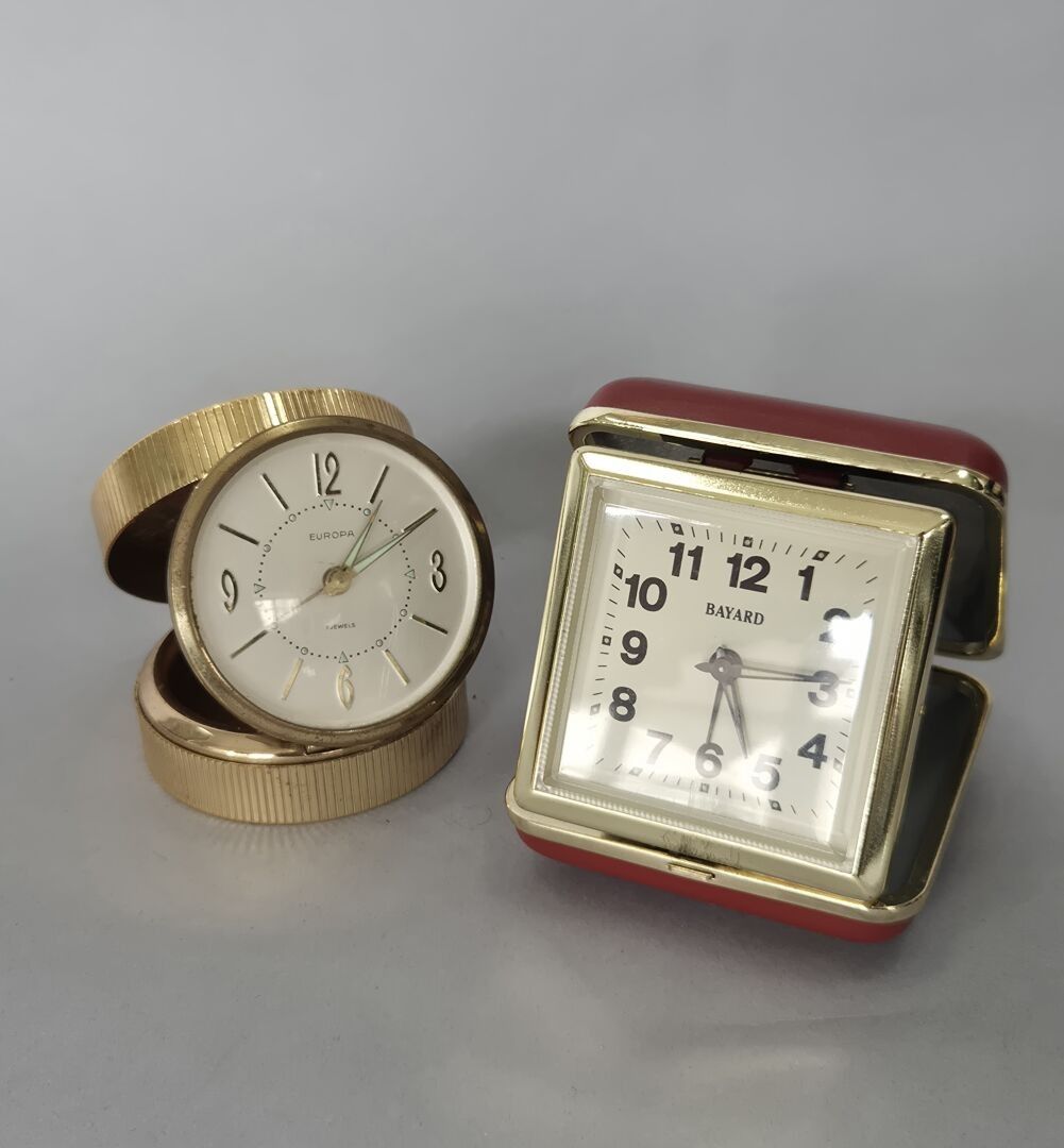 - Bayard, Square travel clock in gilt metal sheathed in red leather, cream dial