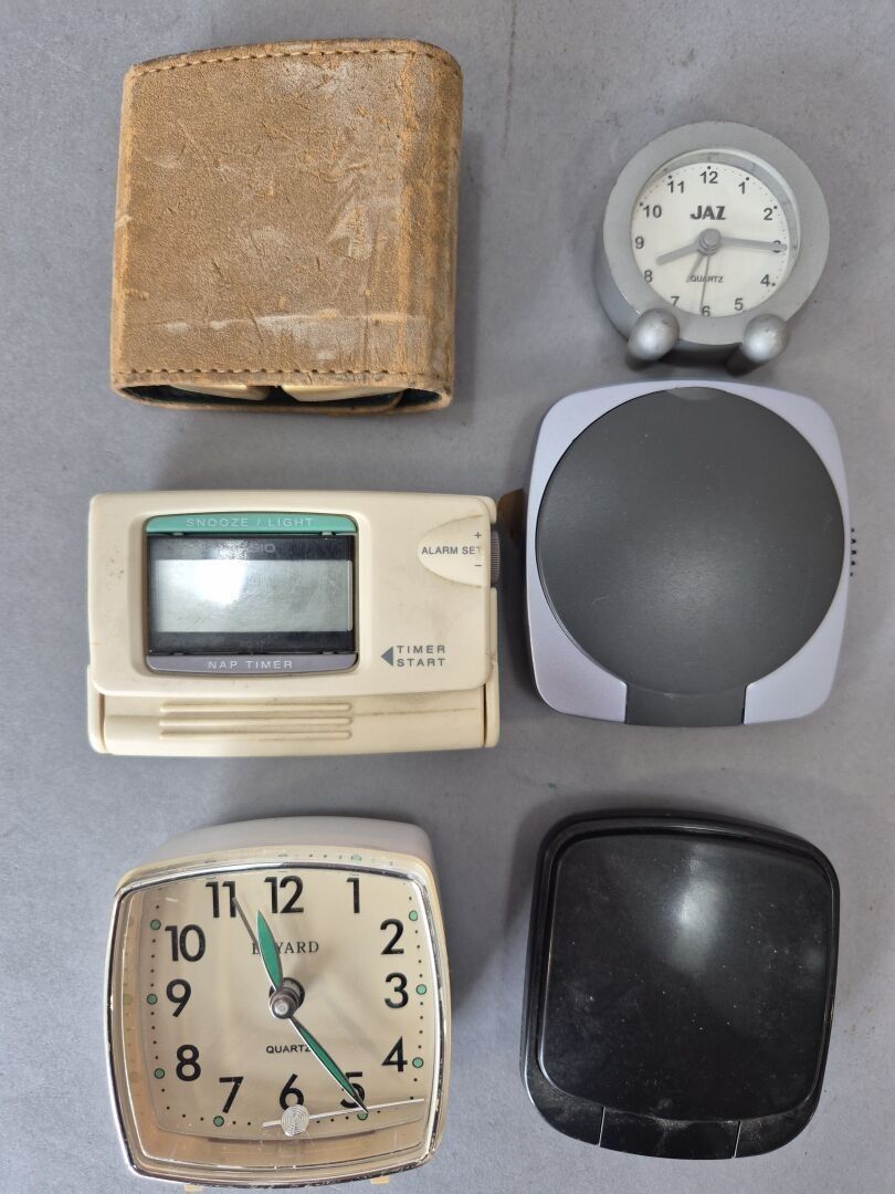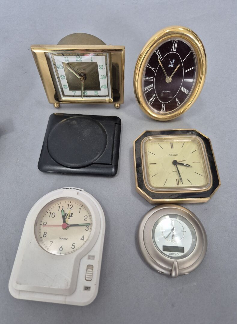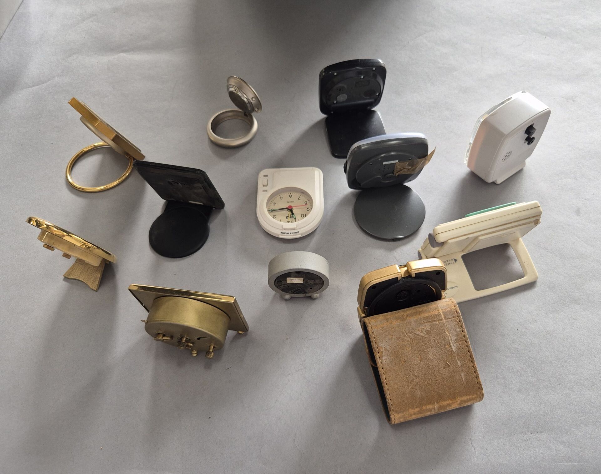 Set of twelve alarm clocks, including travel clocks