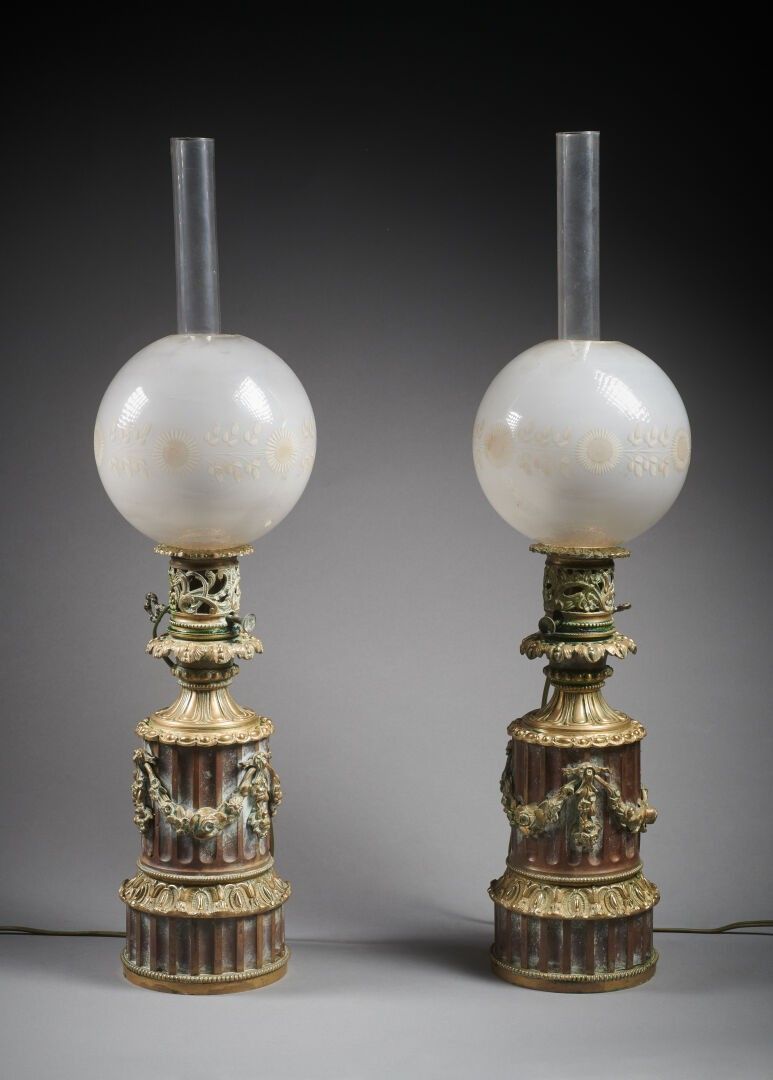 Pair of oil lamps In gilt brass decorated with garlands of f…