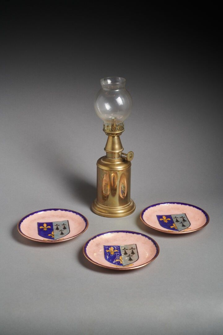 Three enamelled dishes with the coat of arms of the town of HOUDAN signed D.SAUVIN on the reverse.