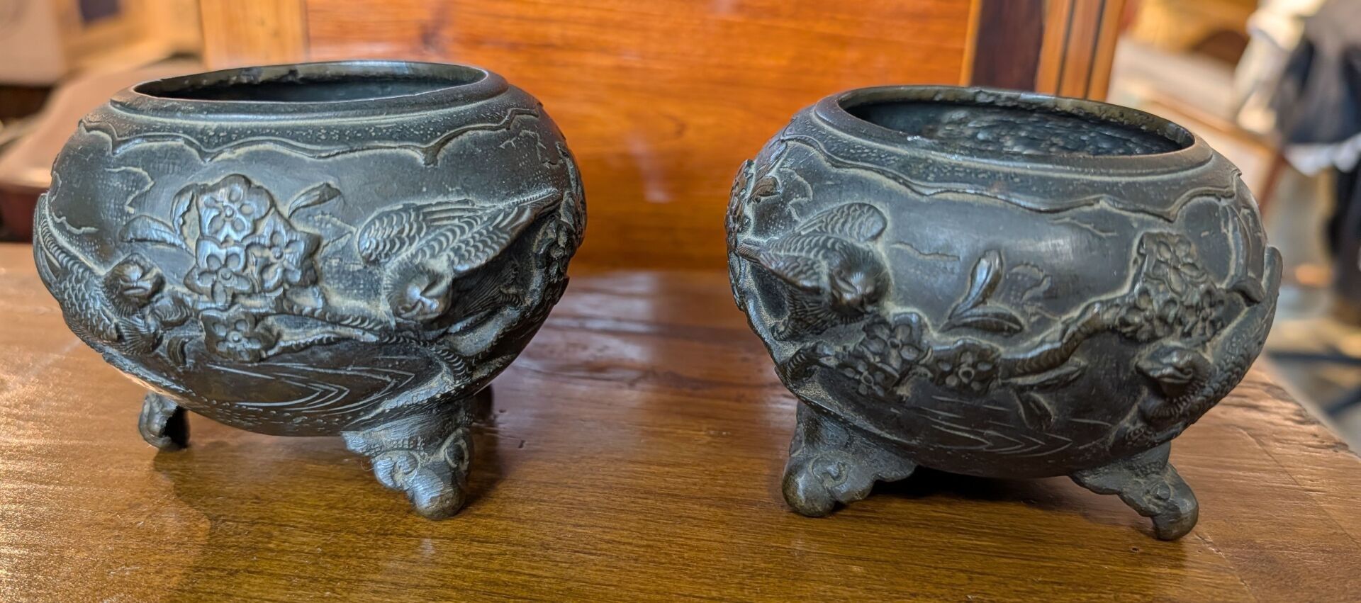 Two bronze tripod bowls decorated in relief with birds and flowering branches