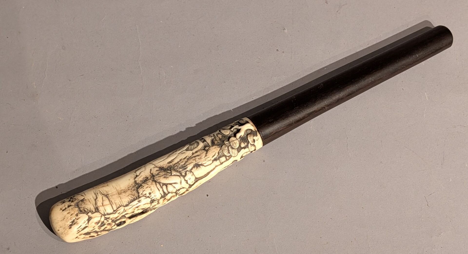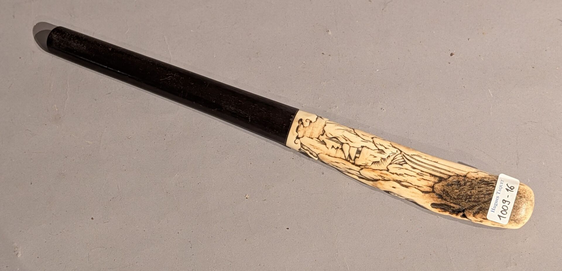 Bone and wood cane decorated with a figure at the foot of the cliffs