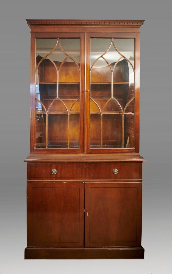 In mahogany and mahogany veneer, opening at the top with two glass doors and at the bottom with two doors and a sliding drawer forming a scriban.