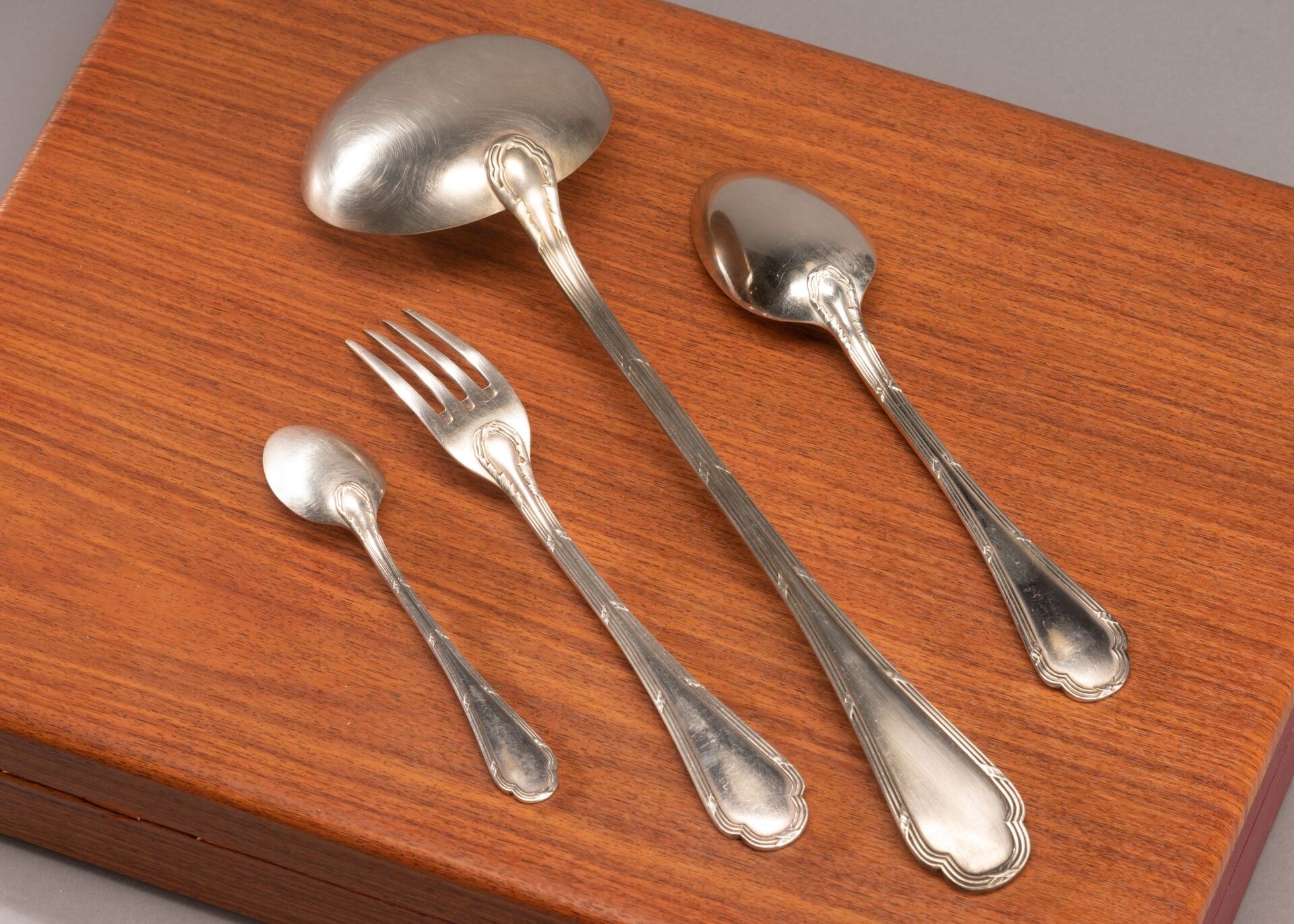 Comprising twelve soup spoons, twelve table forks, twelve teaspoons and a ladle