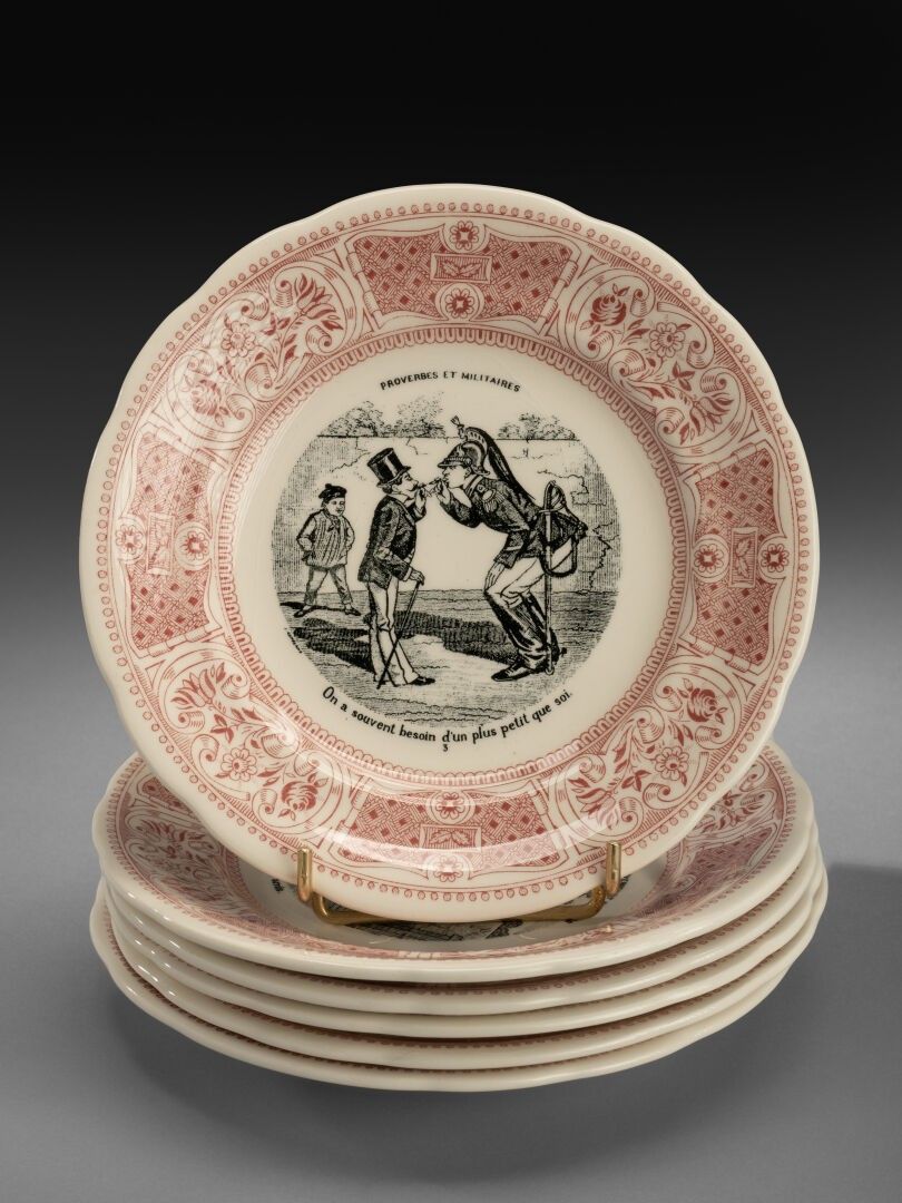 Suite of six dessert plates on the theme "Proverbs and soldiers".