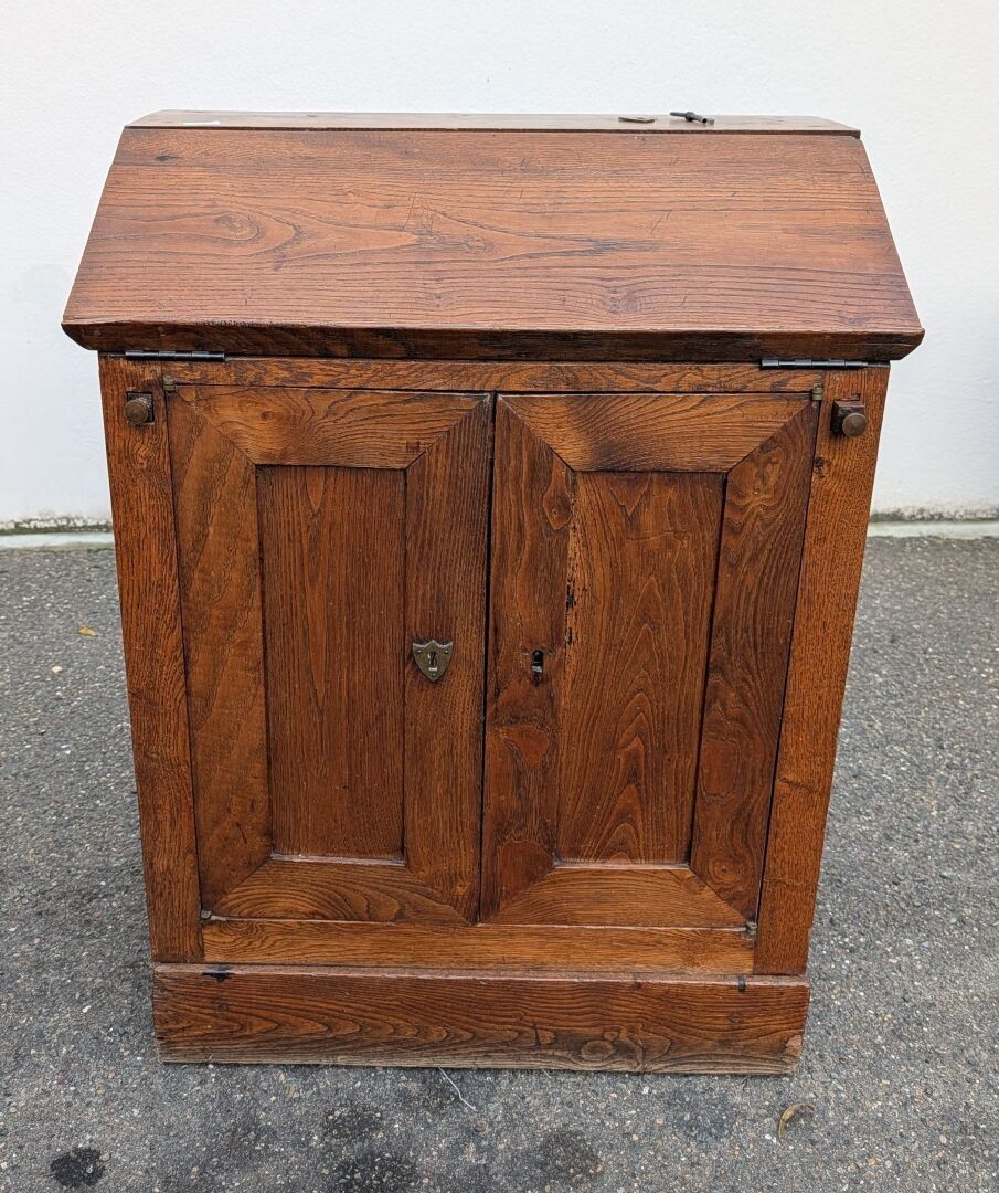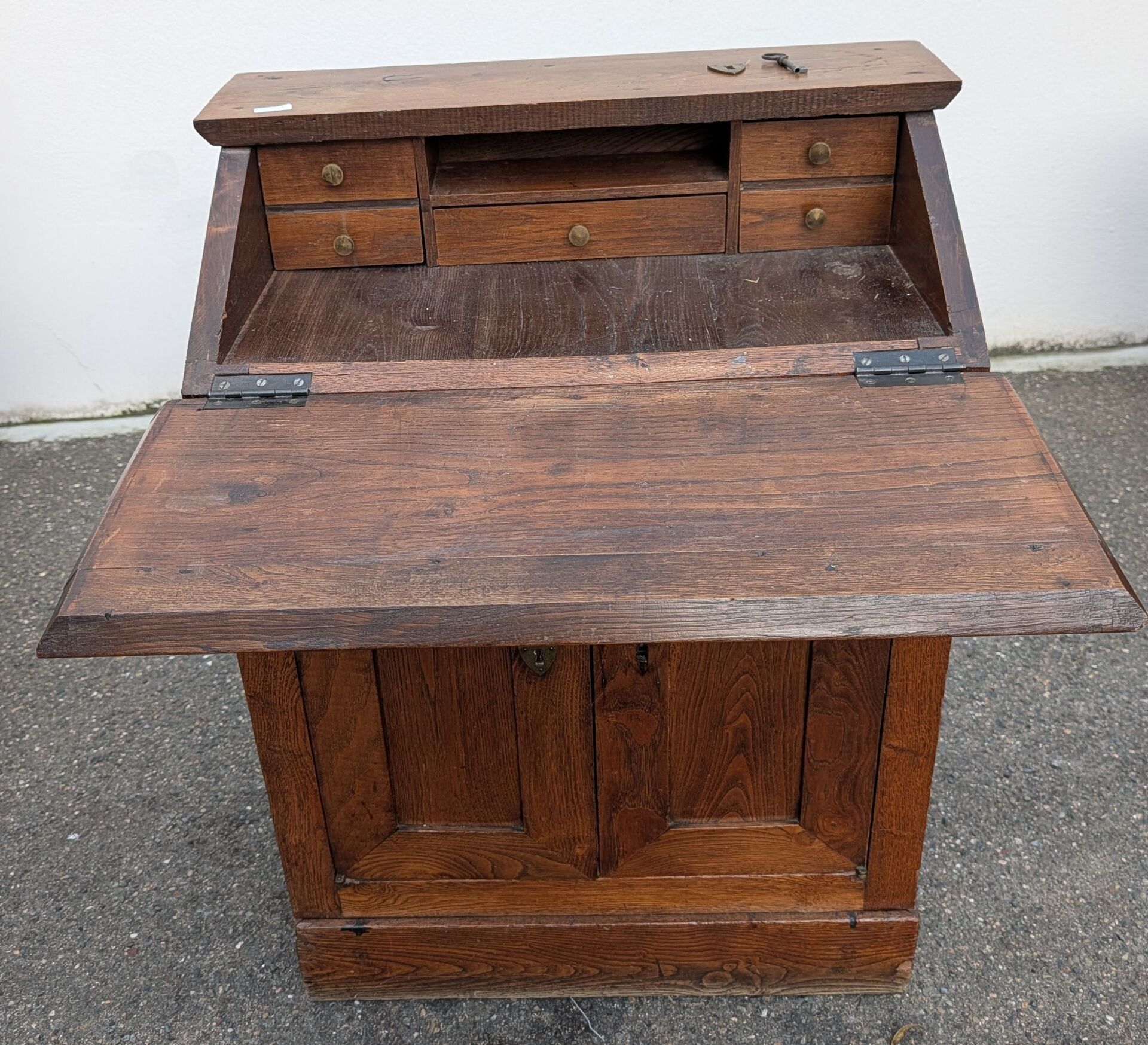 In rustic wood opening to a flap revealing five drawers, and two doors in the lower part.