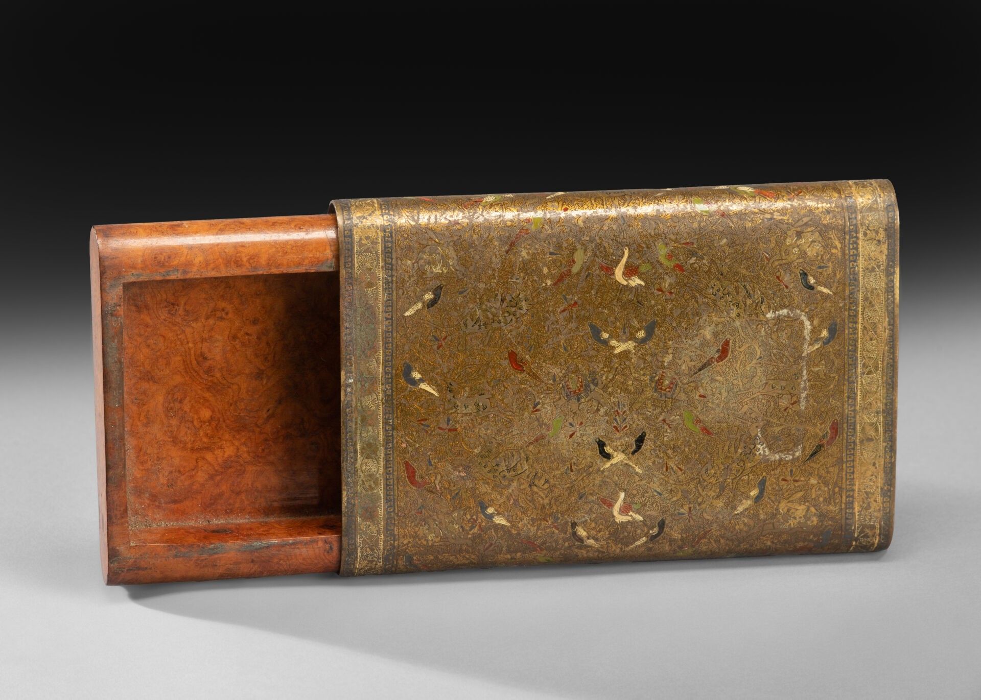 In a burrwood box, the sliding lid in chased and enamelled metal with birds and elephants in Japanese style.