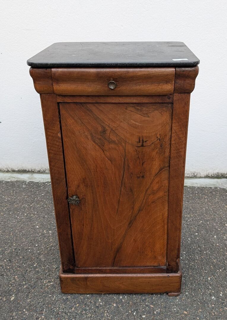 In wood and veneer opening to a drawer and a door, black marble top
