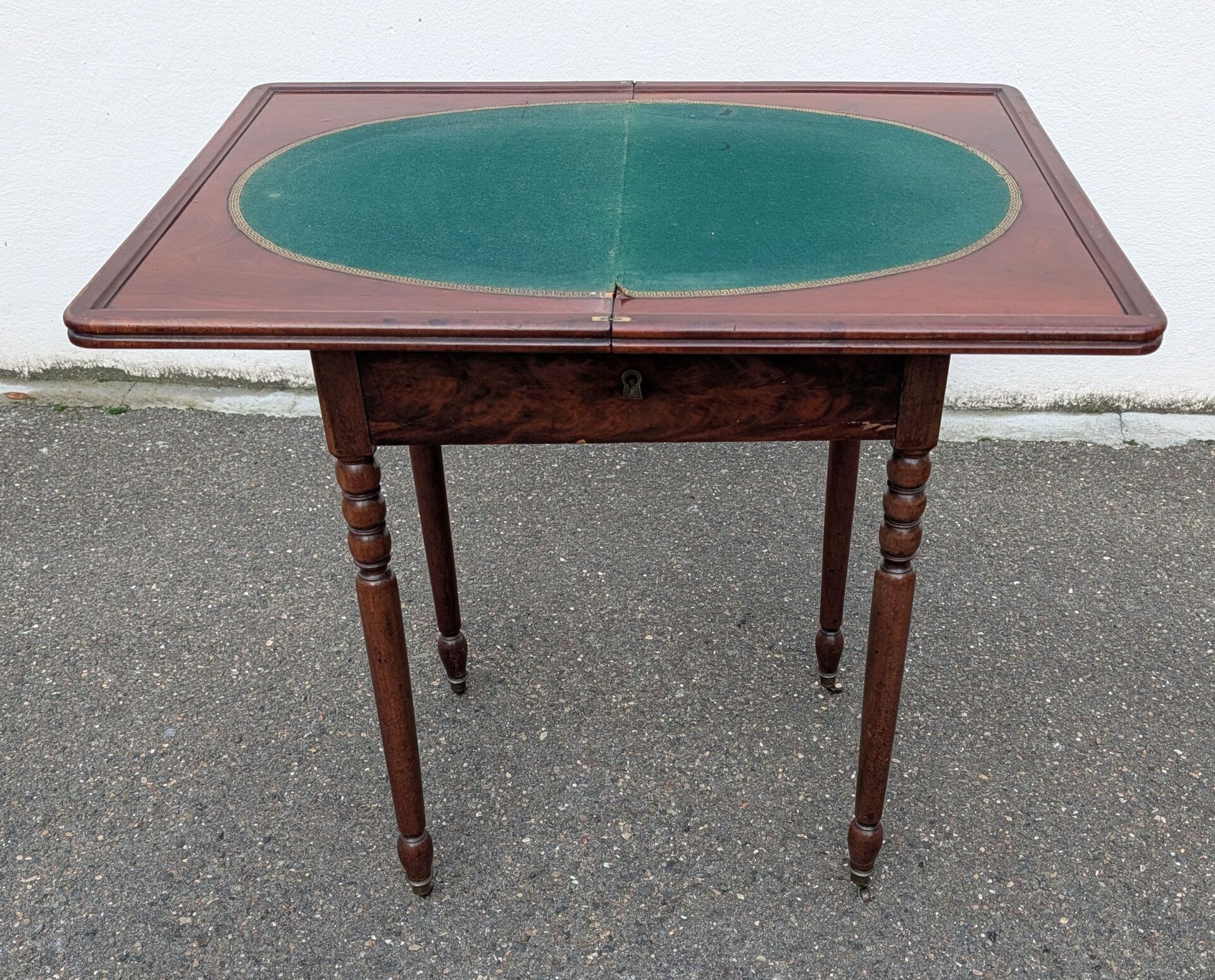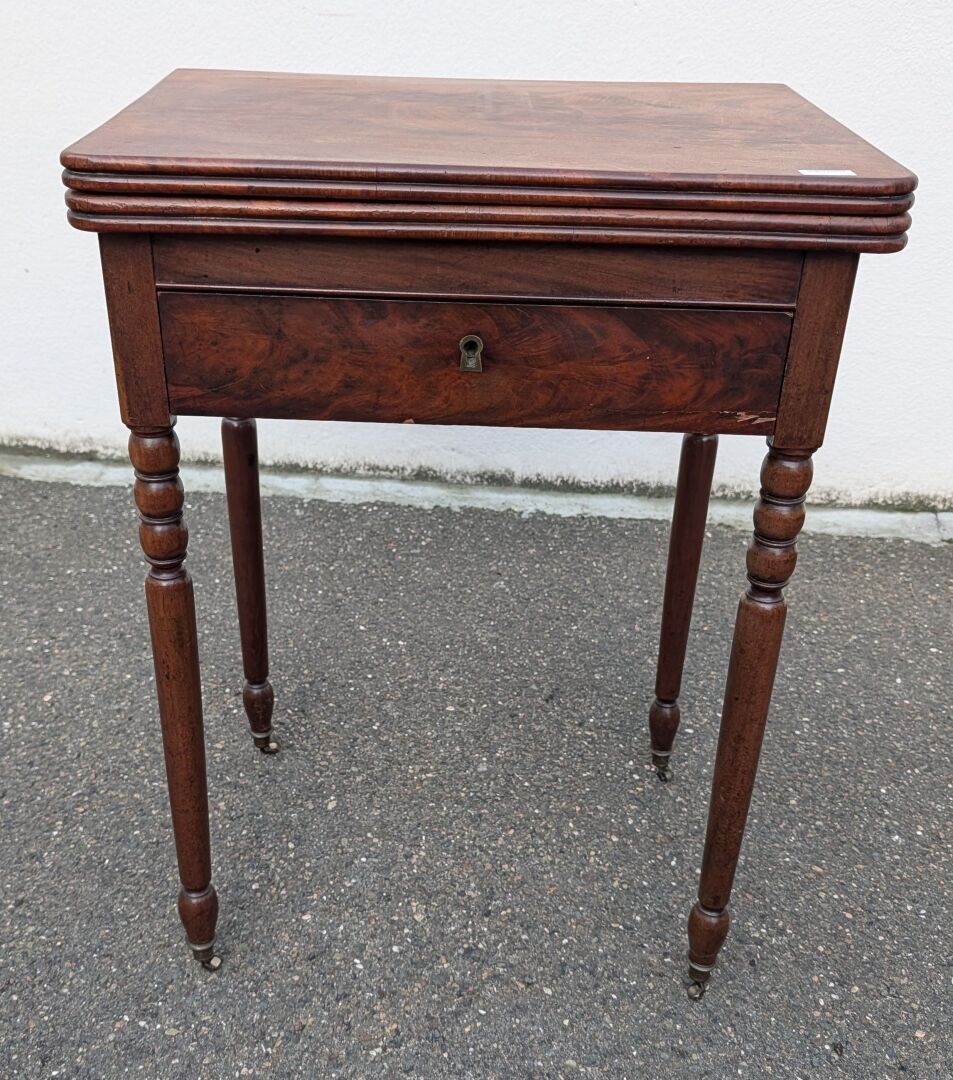 In wood and veneer, with a rectangular top that swivels and folds out, opening with a drawer, resting on four baluster legs.