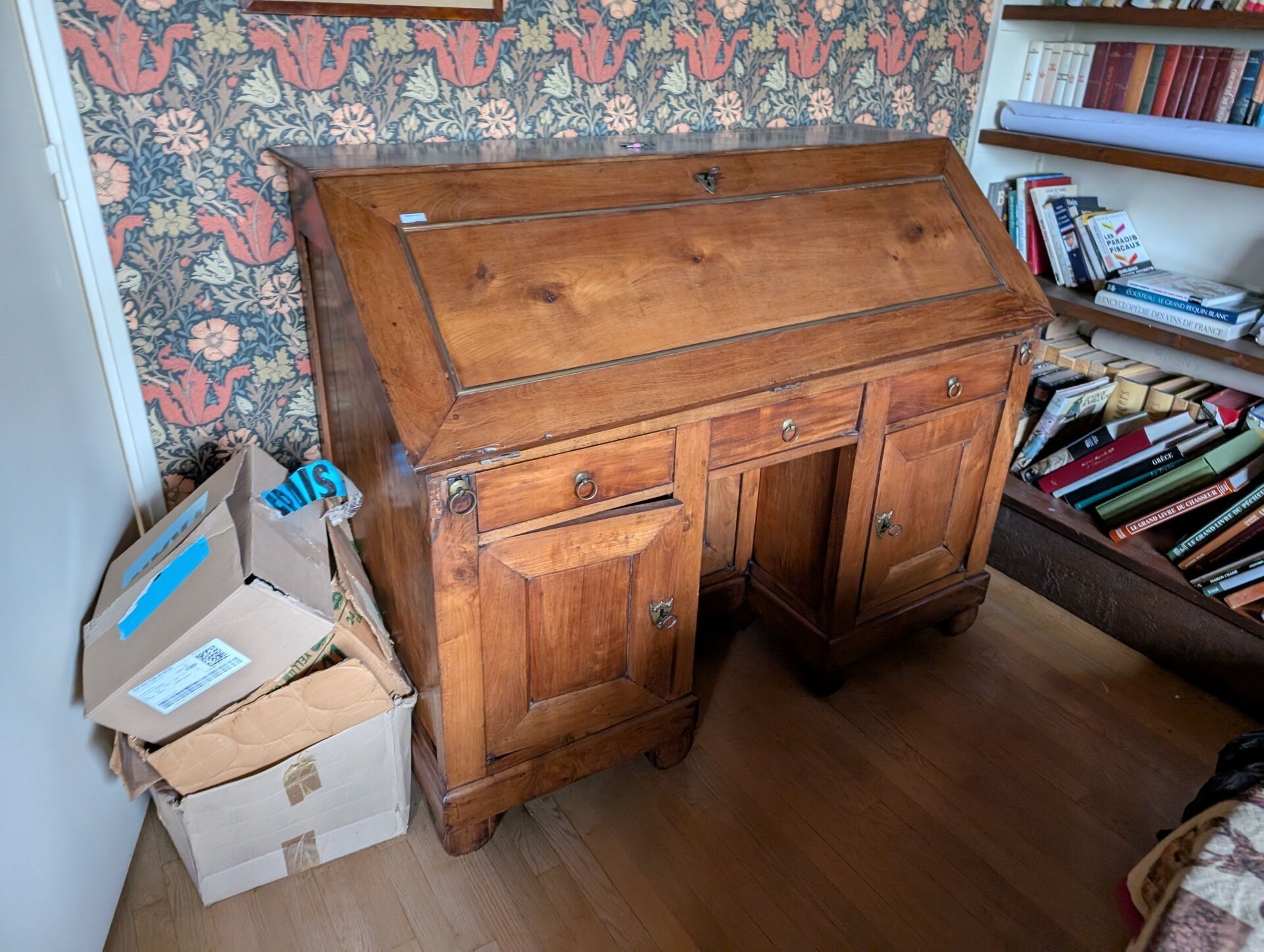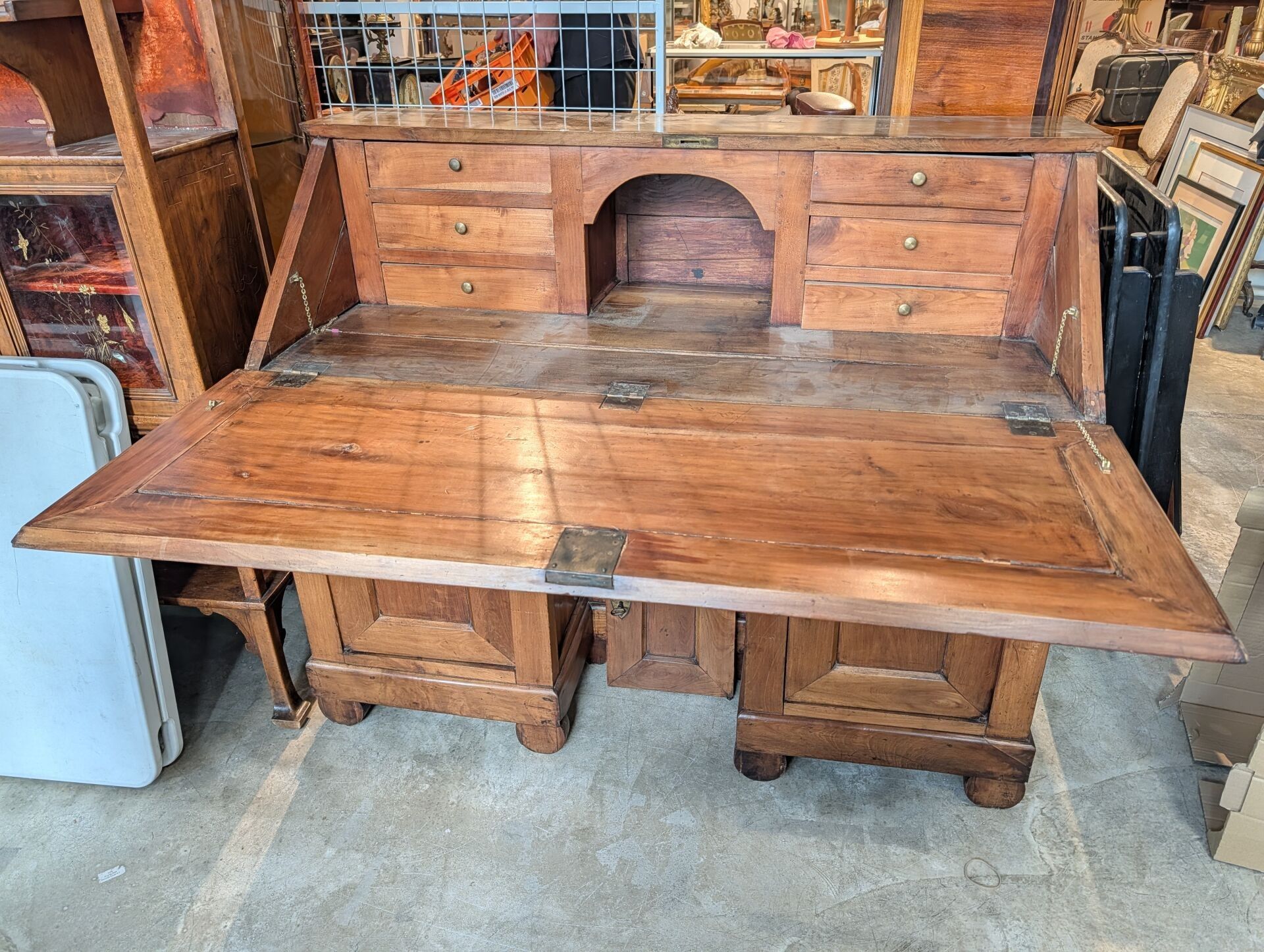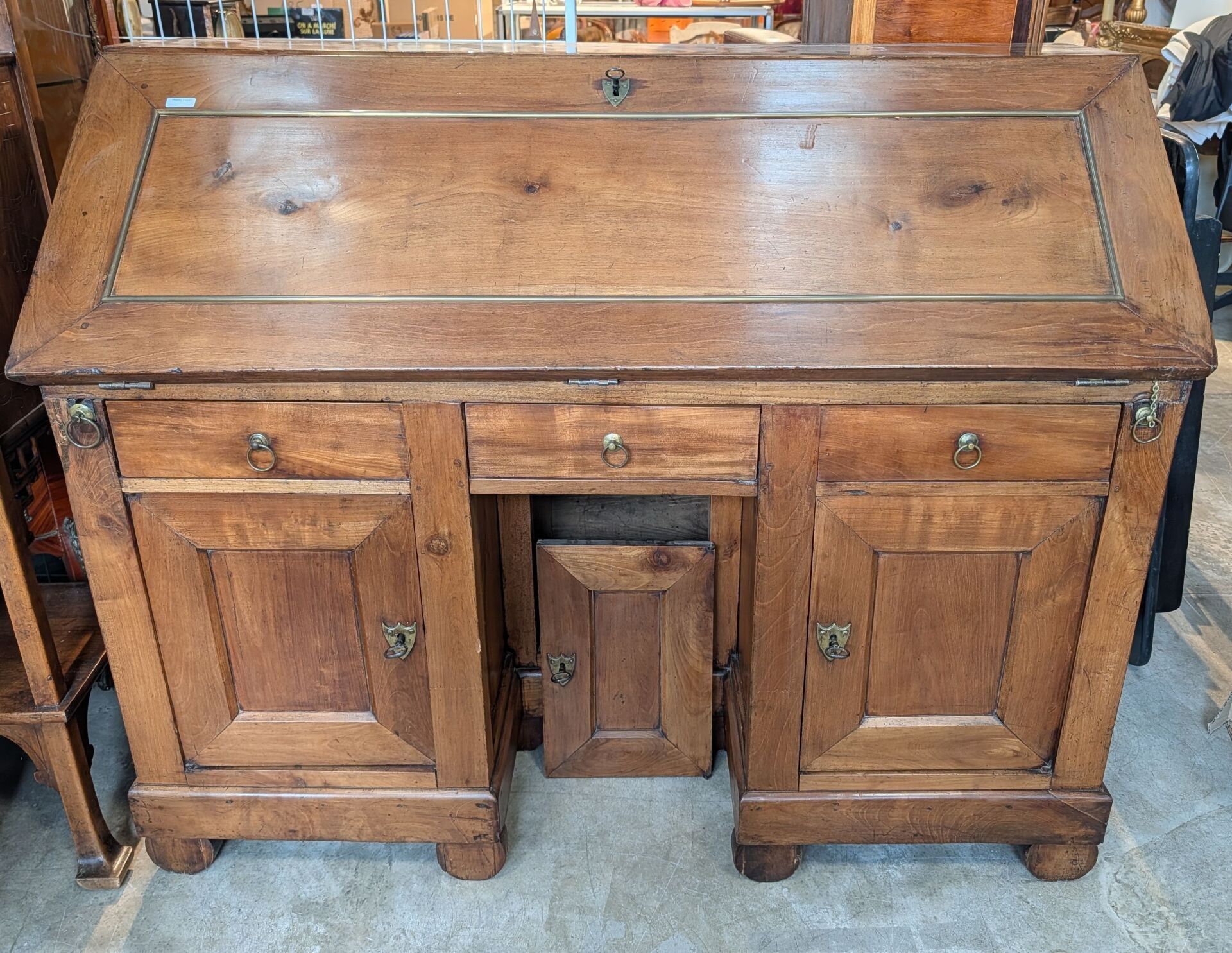 In wood and brass opening to a flap revealing drawers, three drawers in the waist and three doors