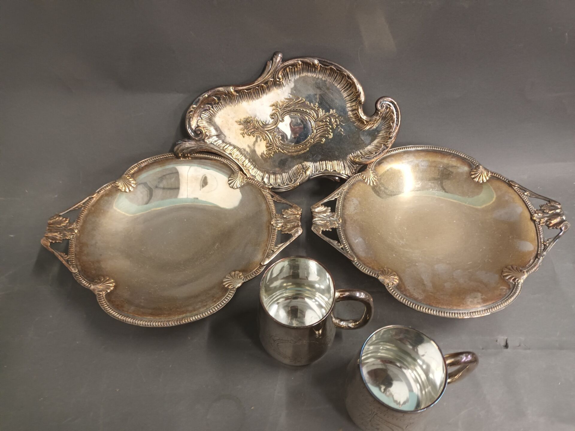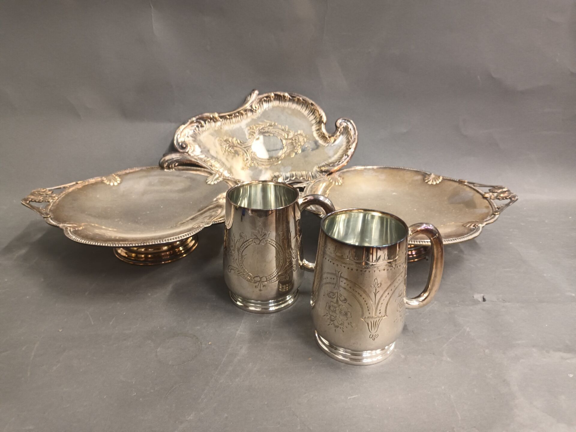 A batch of silver-plated metal, comprising two cake or compote dishes on Louis XV / Rocaille style legs, a silver-plated pocket dish and two silver-plated beer mugs.