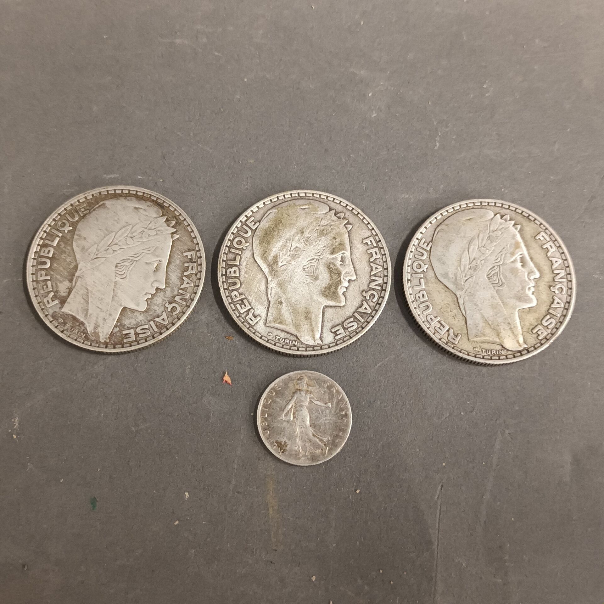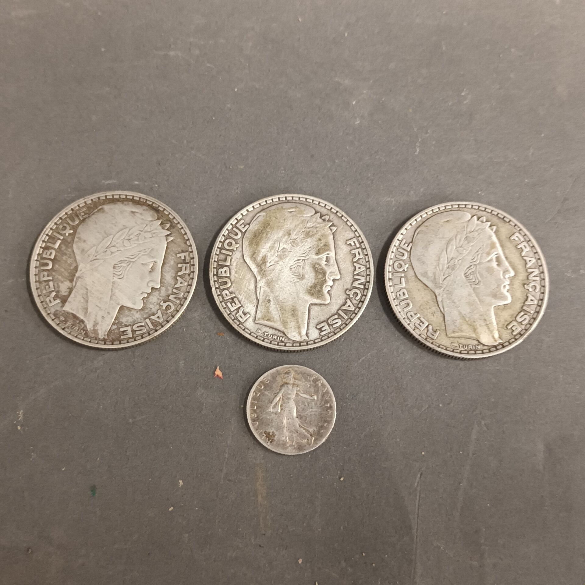 Three 20 rand Turin silver coins, and a small 50 centime Semeuse silver coin, 1929 and 1933,