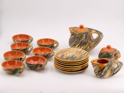 V-M. A. - OLIVEZO TEA-SERVING SET in green and orange glazed…
