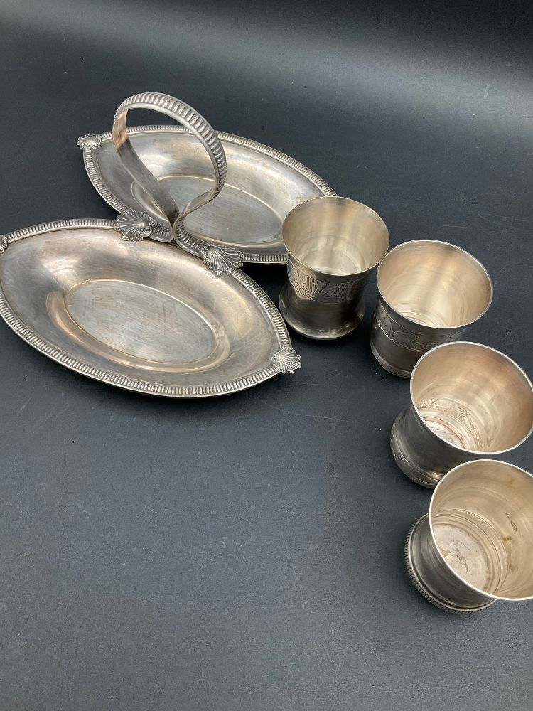 A set of 4 beautiful silver-plated goblets and a display sta…