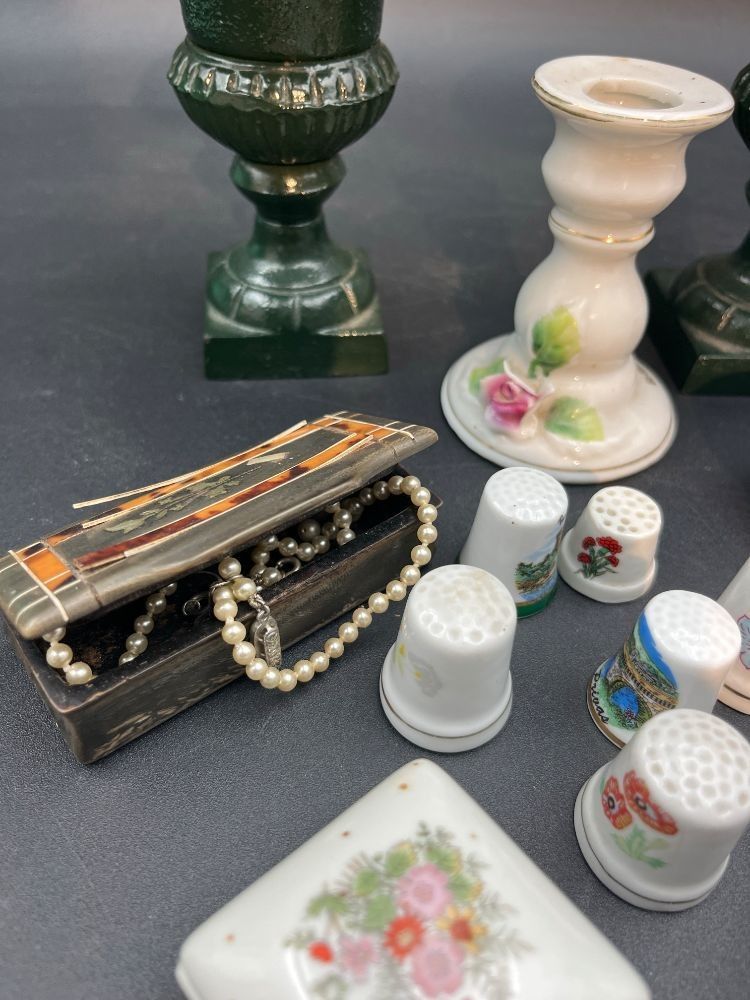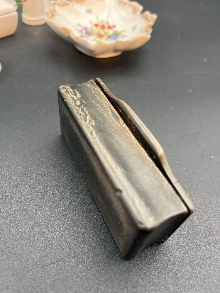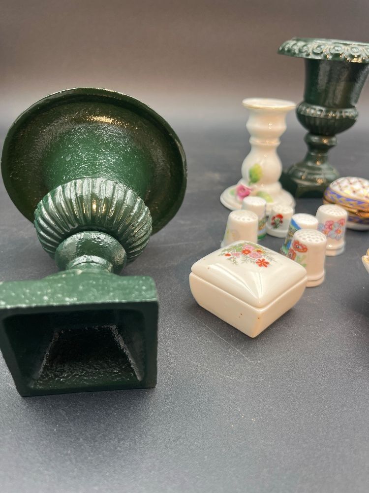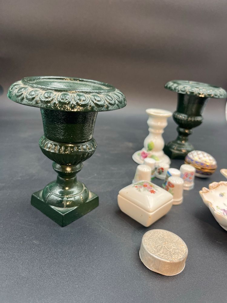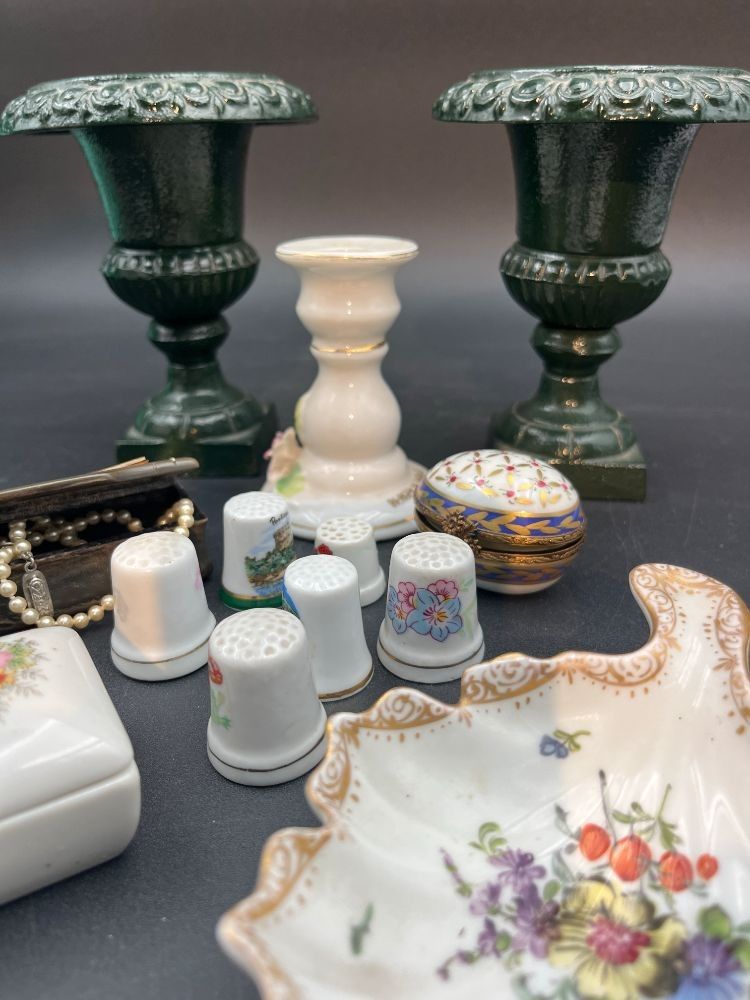 2 small cast-iron Medici vases (13 cm high), a barbotine candlestick, a small jewellery box (Limoges), a wax box (Cheramy) early 20th century, a horn jewellery box with mother-of-pearl inlay and miscellaneous.