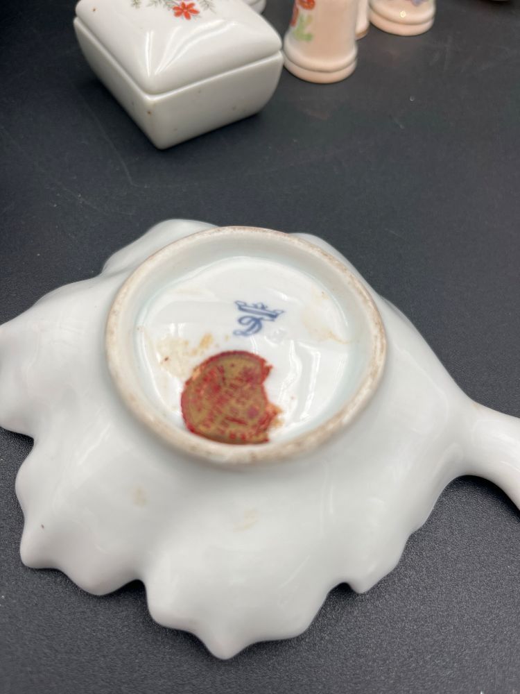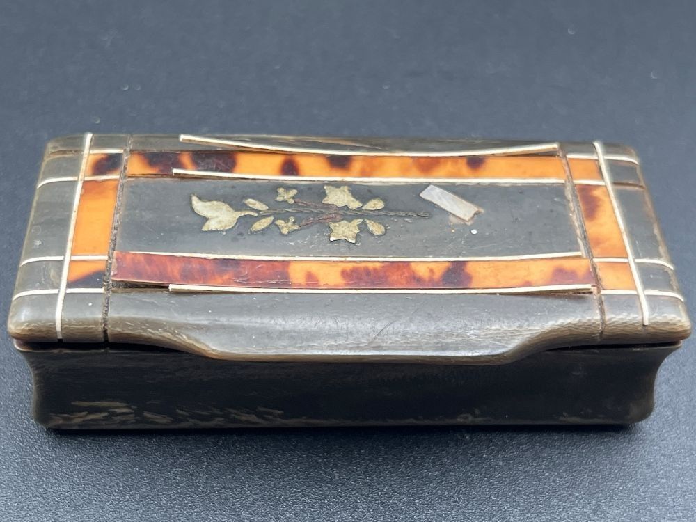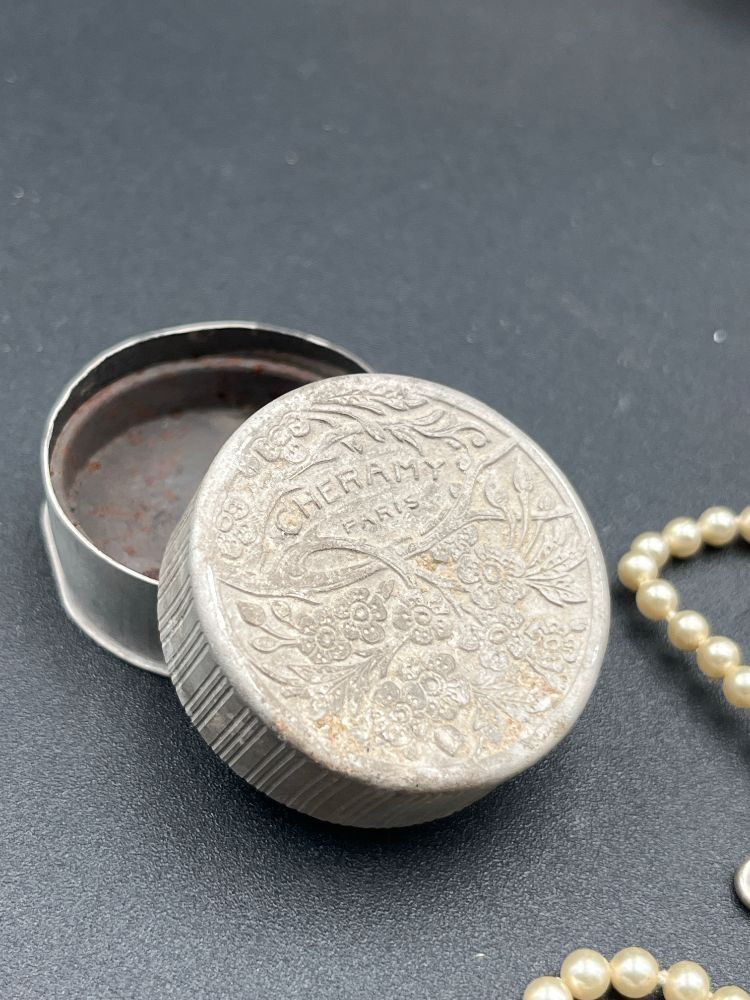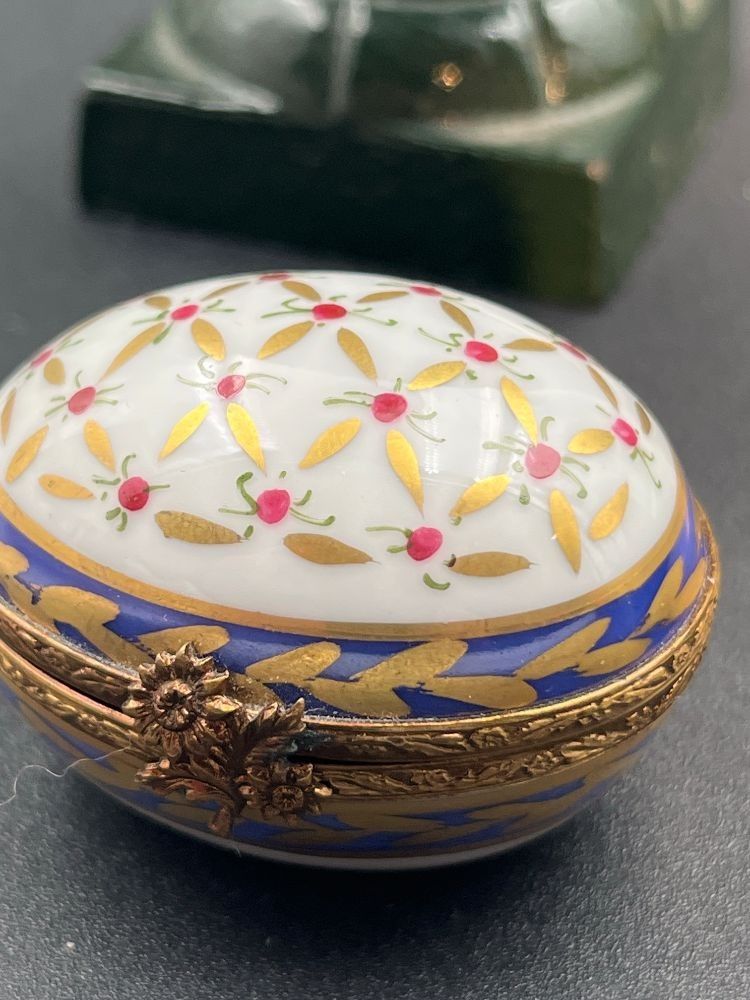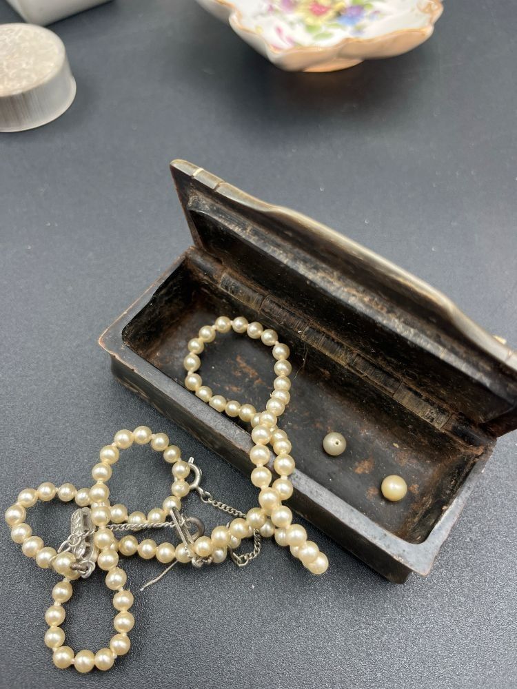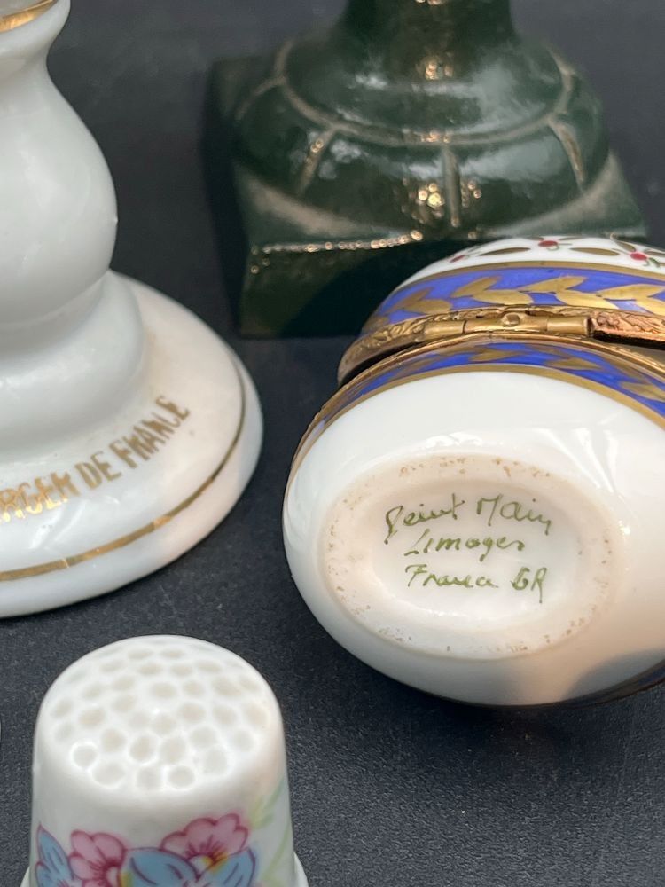 2 small cast-iron Medici vases (13 cm high), a barbotine candlestick, a small jewellery box (Limoges), a wax box (Cheramy) early 20th century, a horn jewellery box with mother-of-pearl inlay and miscellaneous.