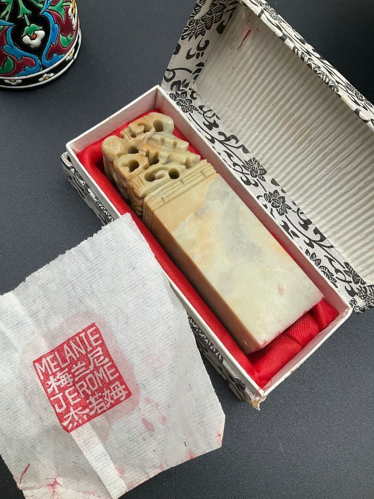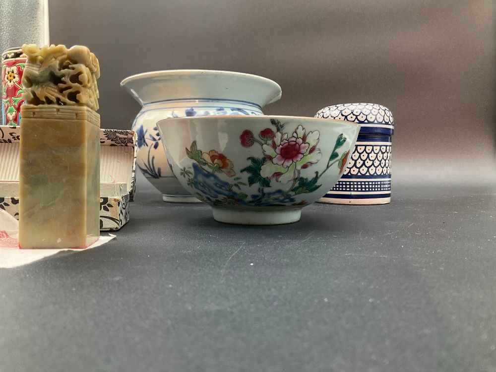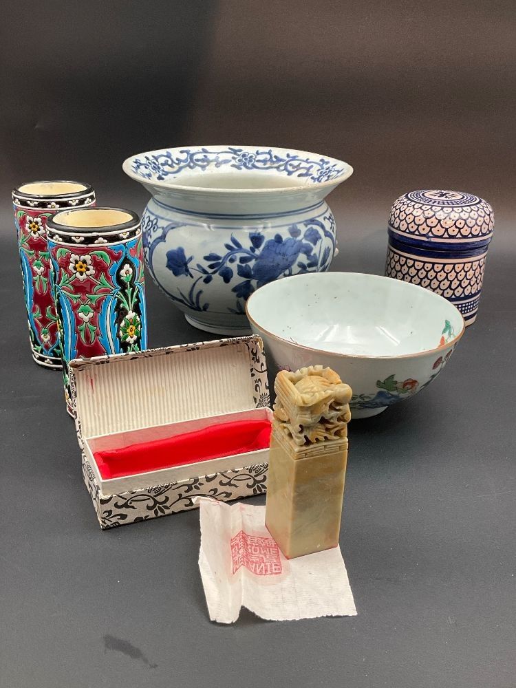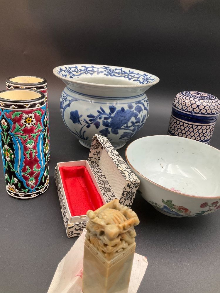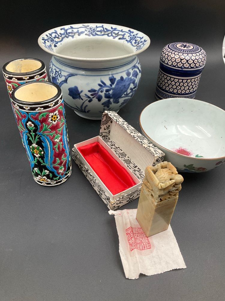 A lot of various Asian ceramics: 2 small scroll vases, a bowl, a stamp and various.