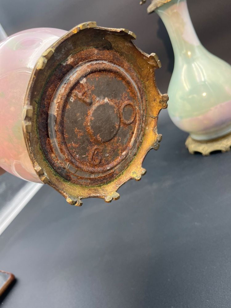 A pair of opaline glass oil lamps in pale glass and pale pin…