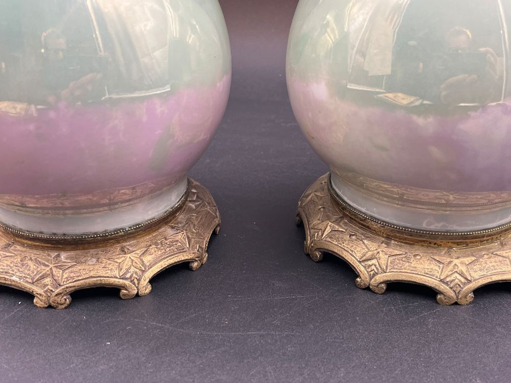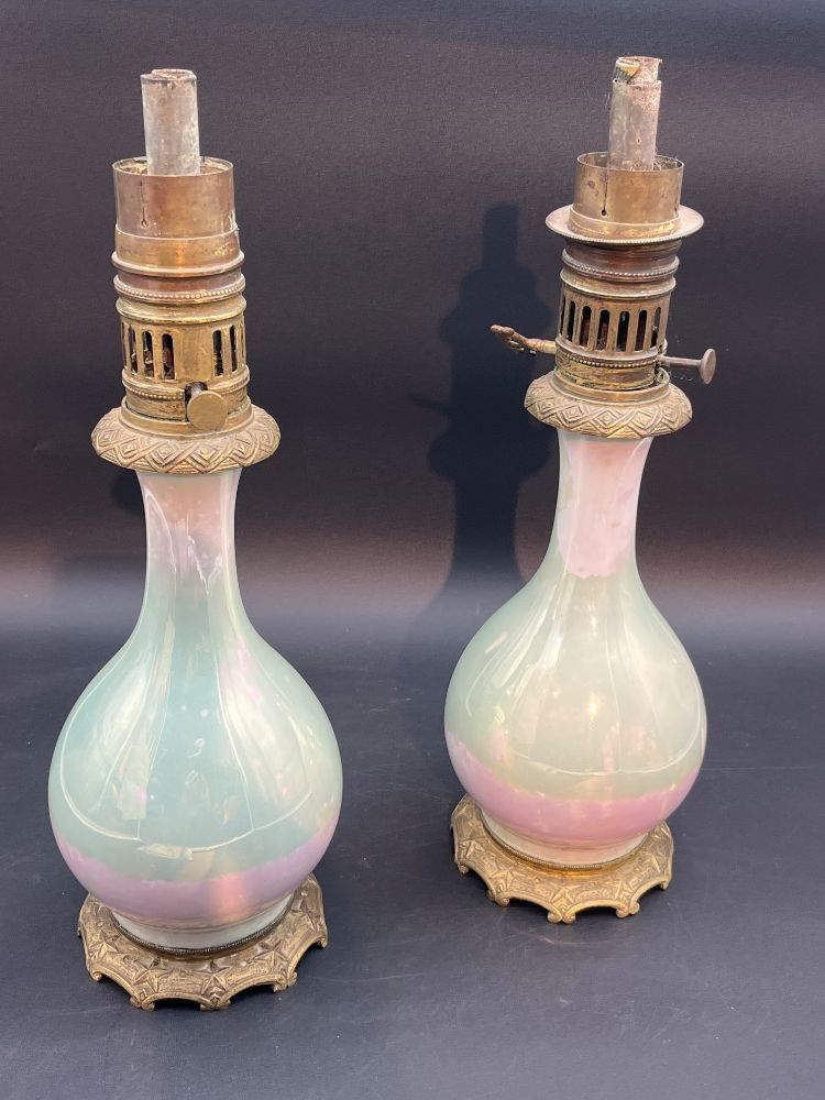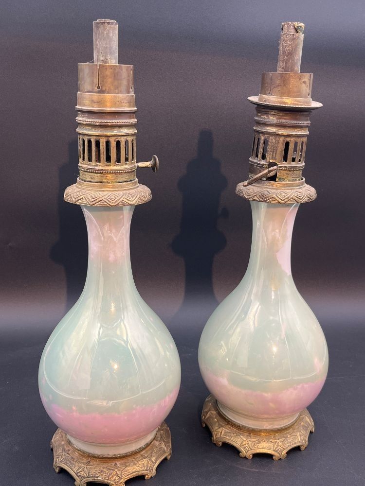 A pair of opaline glass oil lamps in pale glass and pale pink.