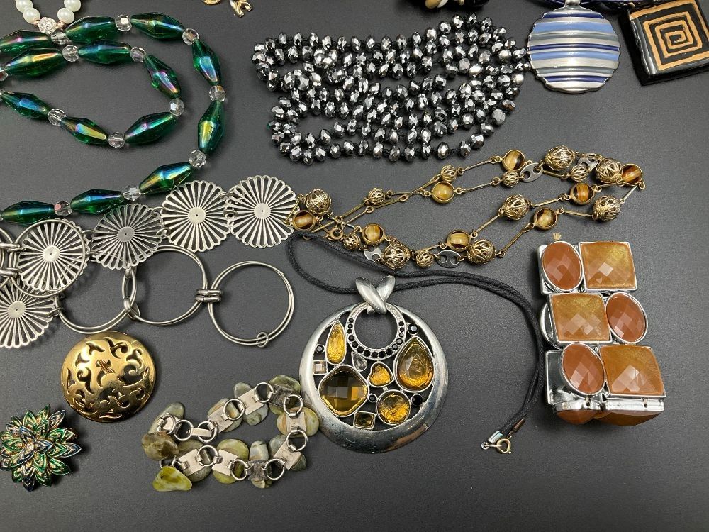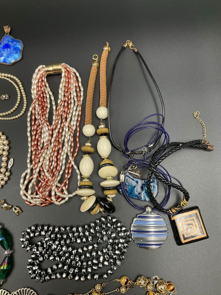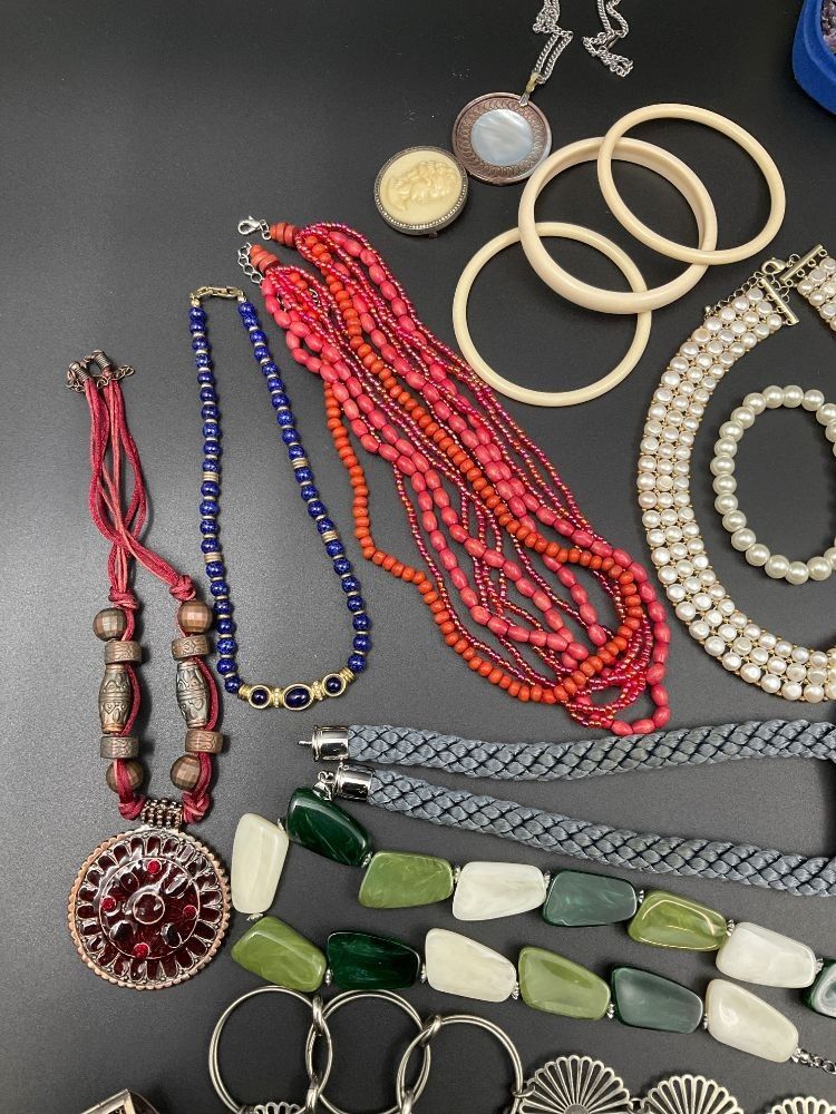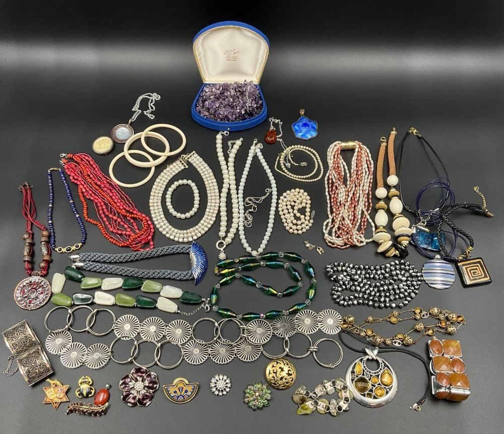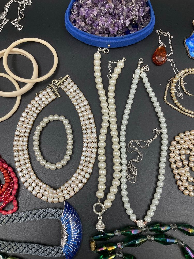 Set of costume jewellery including pearl necklaces, various bracelets, brooches and pendants...