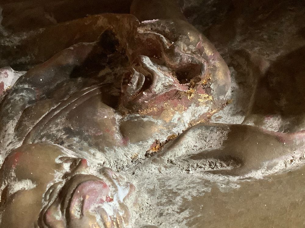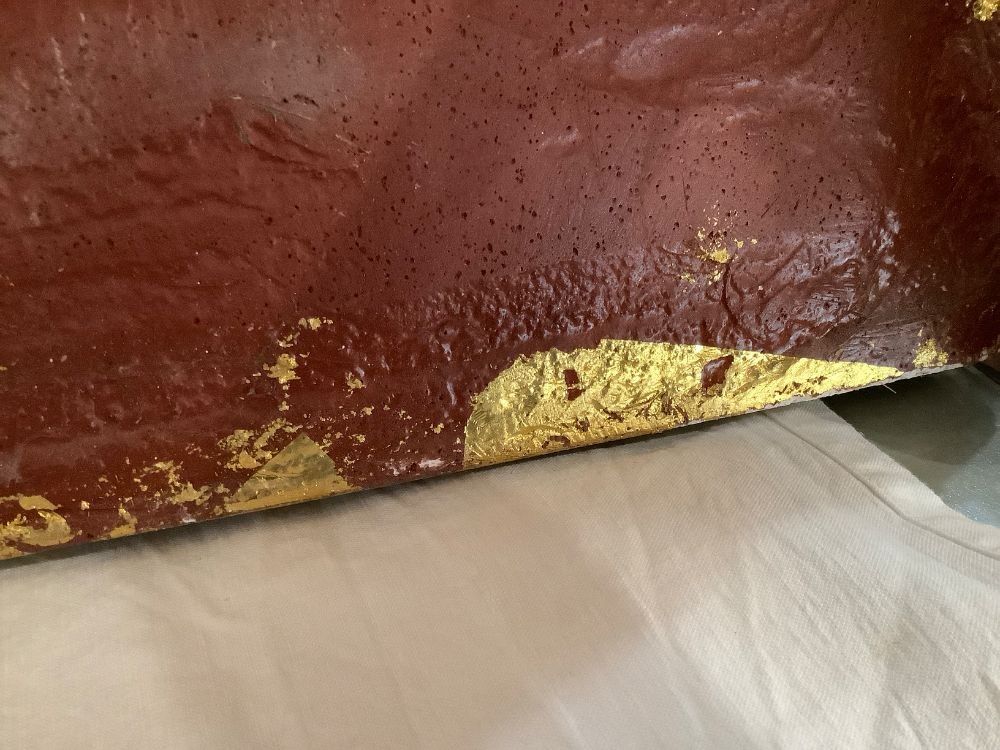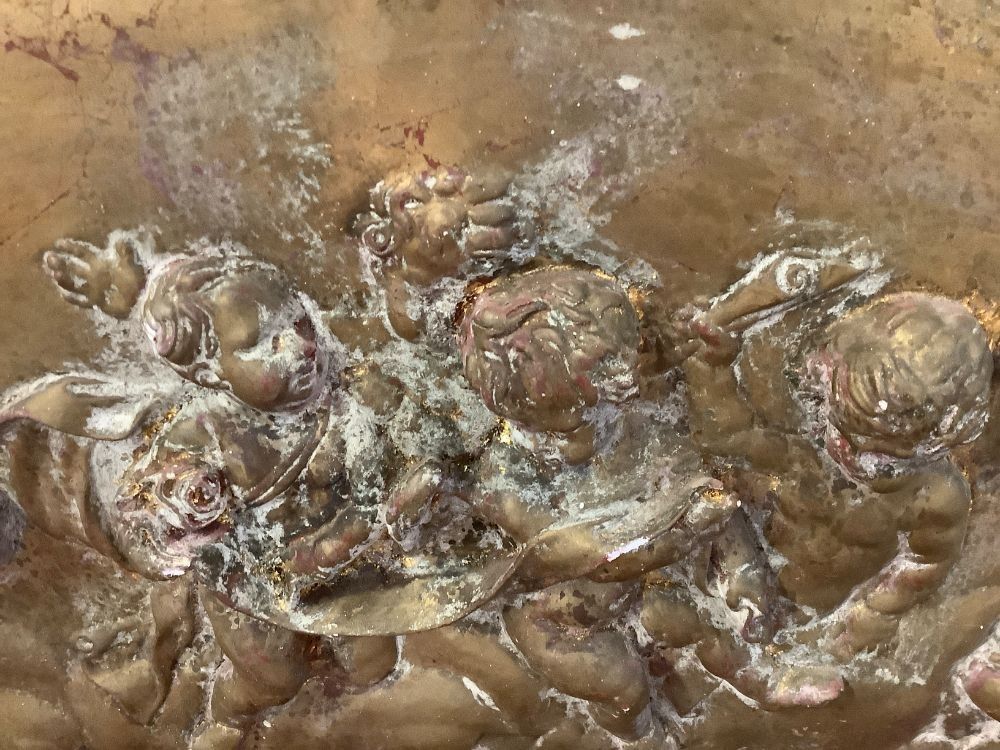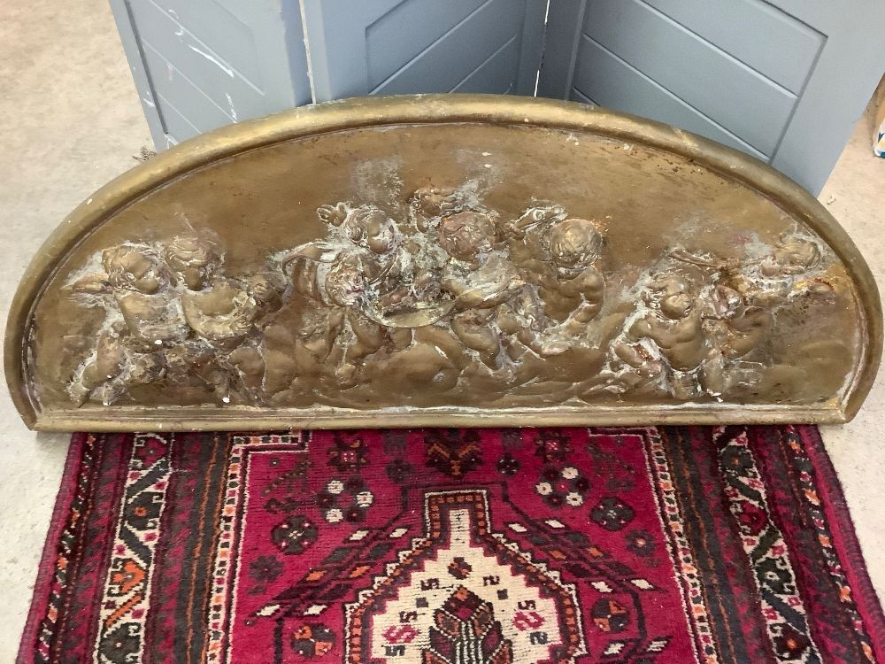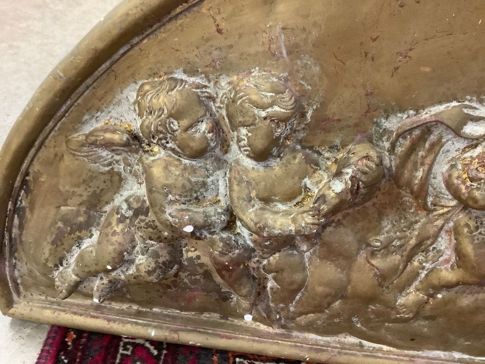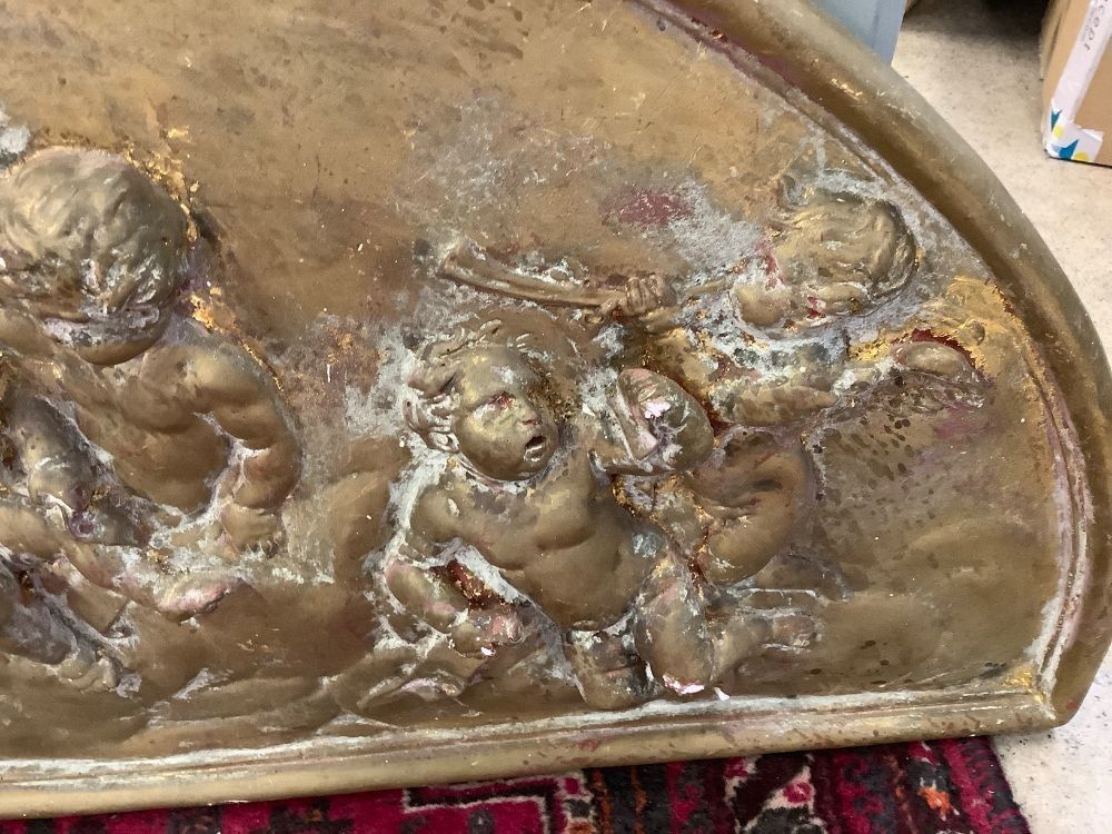 Arch-shaped plaster bas-relief / tympanum representing 8 cherubs. The finish shows beautiful shades of gilded bronze, covering the original gold leaf. Moulding workshop ANTAR. As is, small chips, missing paint. The back ties are cut. Dimensions: width 116 cm, height 53 cm, thickness 2 cm.