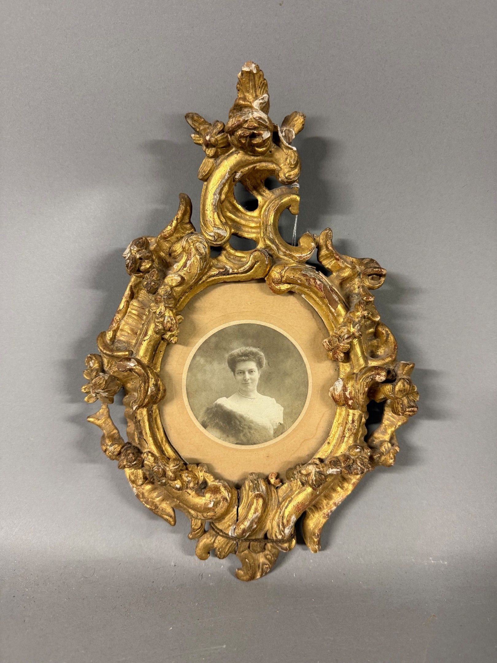 A moulded, carved and gilded wooden photo frame with an oval view. Rococo style. H 31 cm W 22 cm. Damage.