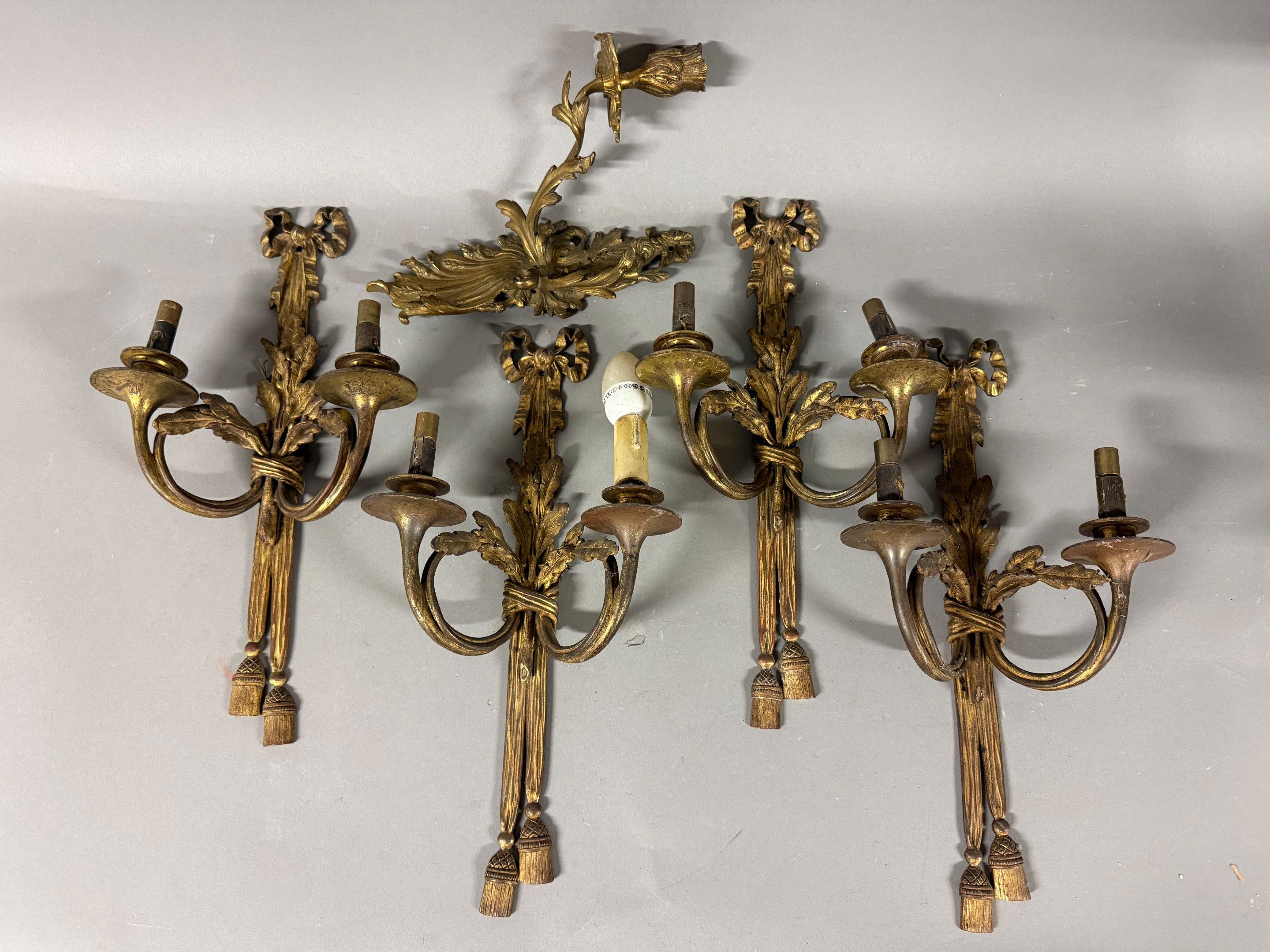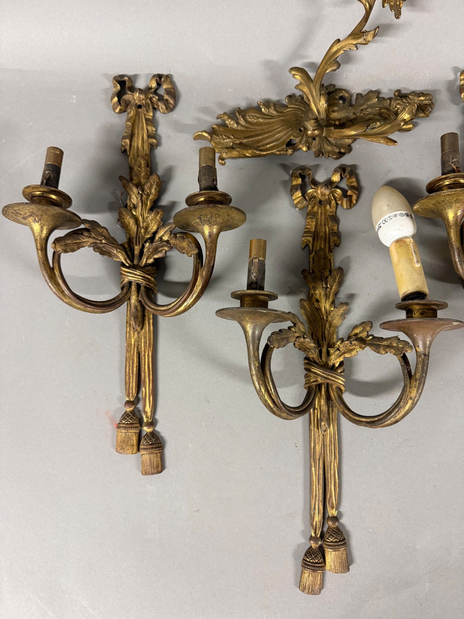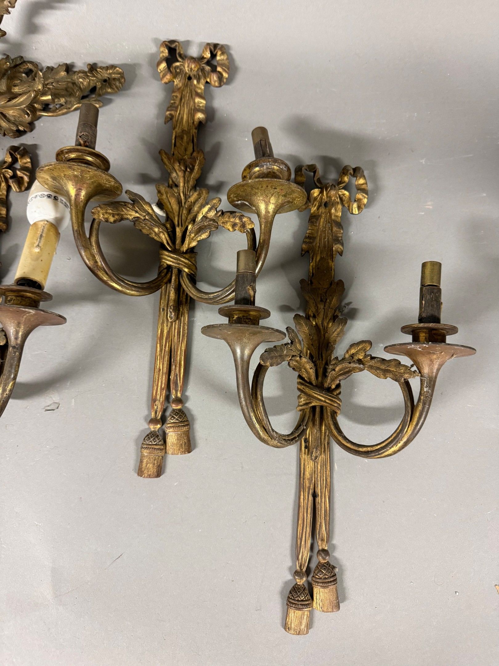 FOUR ormolu sconces. Louis XVI style. 2 lights. H 42.5 cm. One sconce is damaged in the rocaille style.
