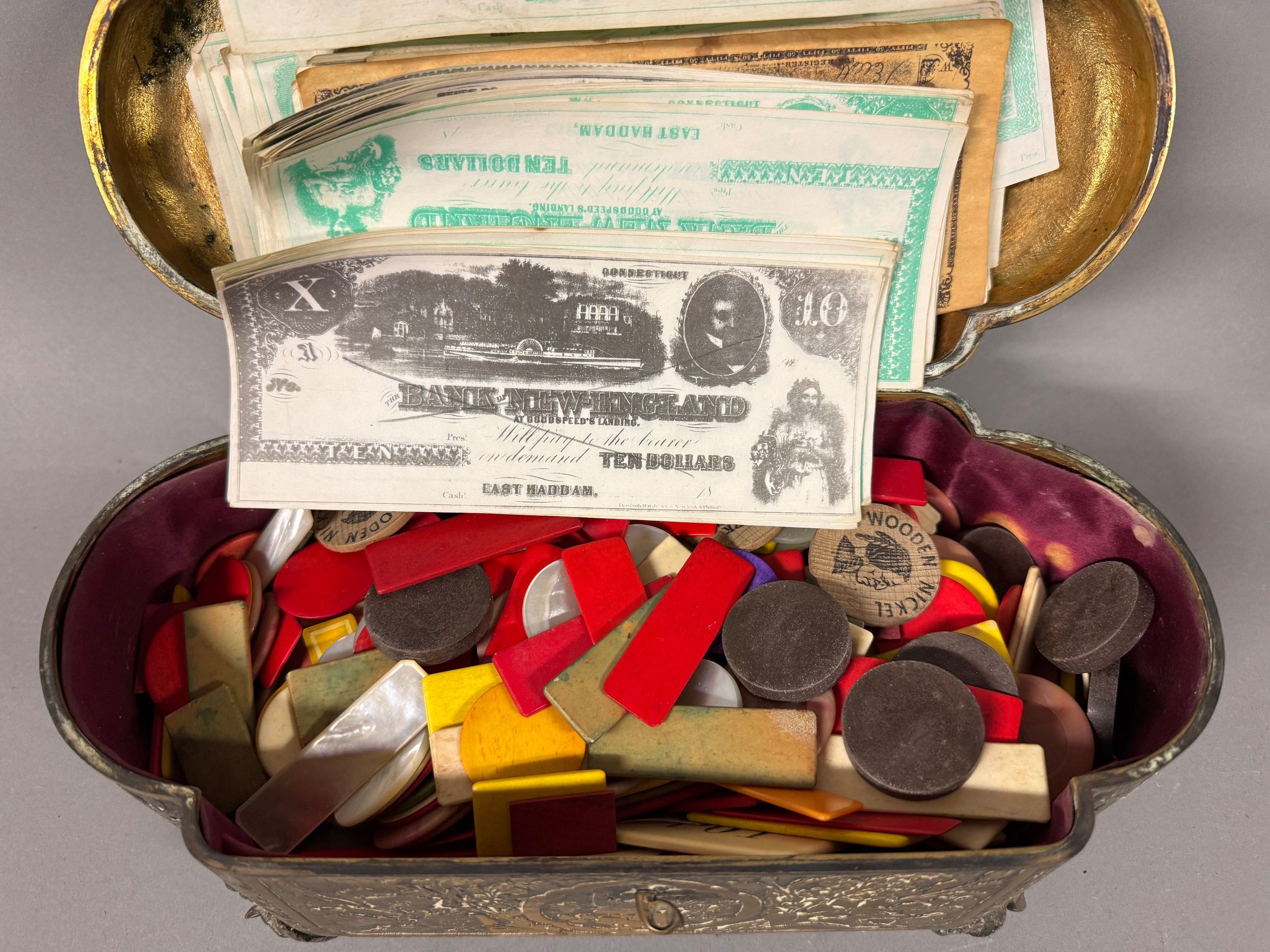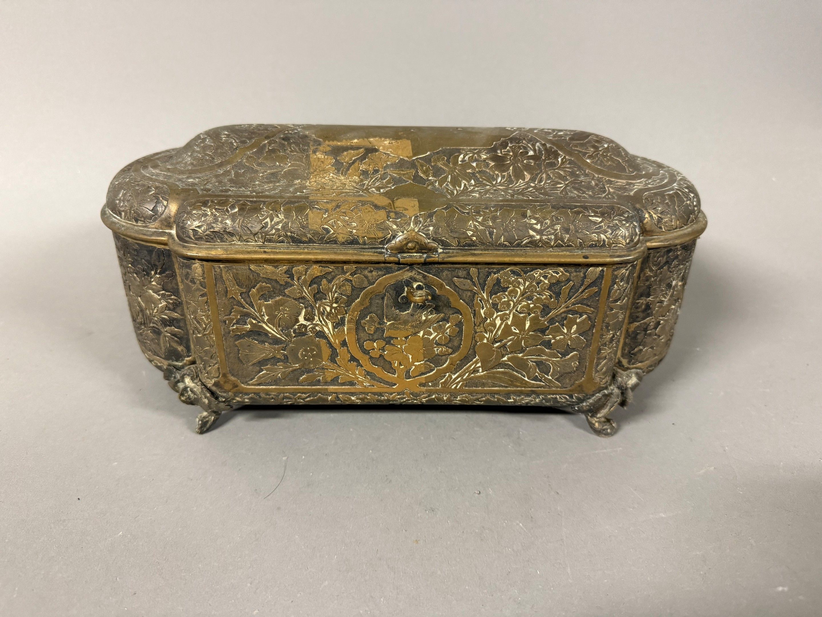 ASIA. Brass box engraved with flowers. Wear and tear. Some tokens attached.