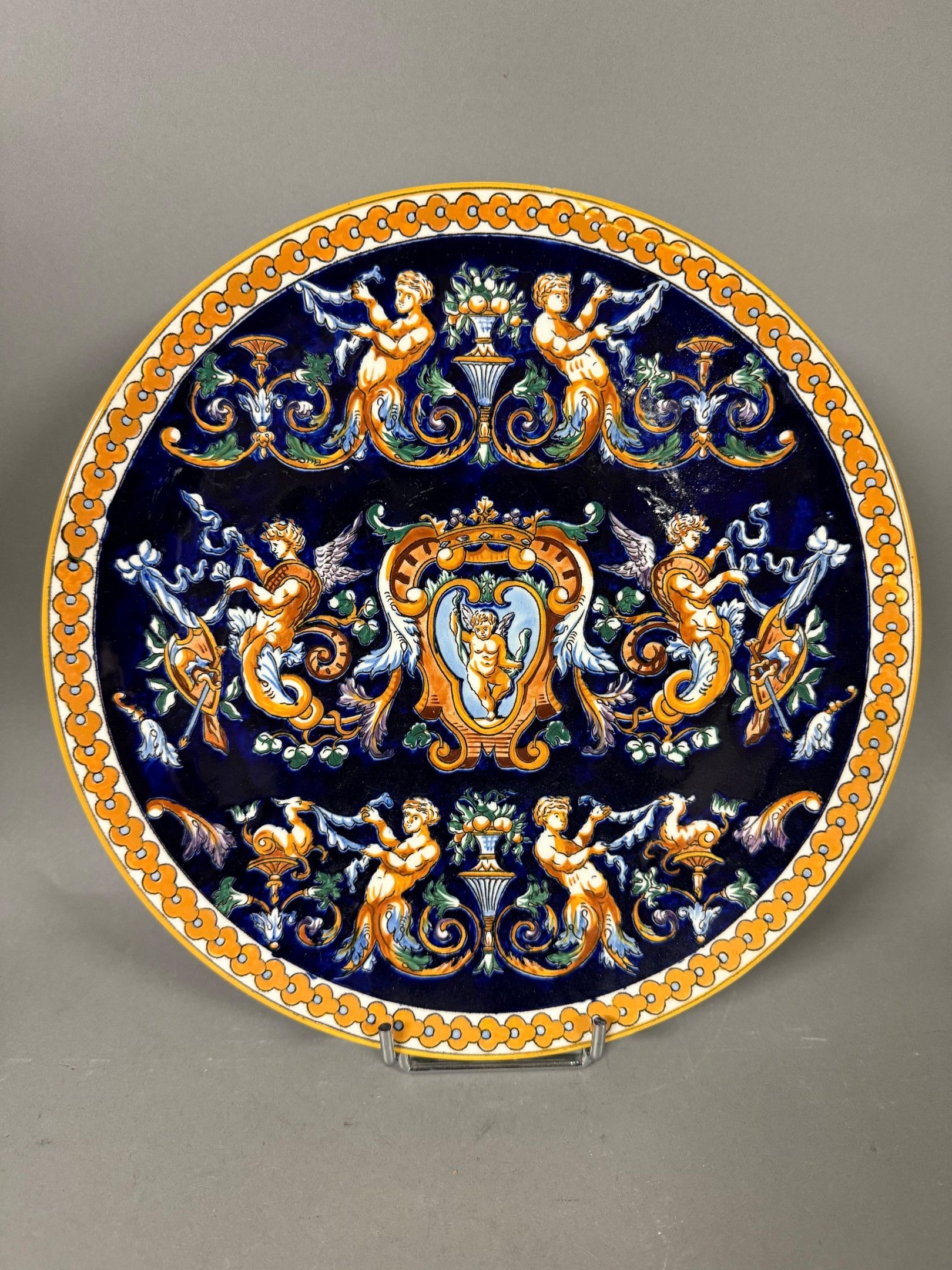 GIEN, France, 20th century. Polychrome enamelled earthenware dish with Renaissance décor on a blue background. D 30.5 cm Signature on the back, guaranteed unalterable, hand-painted firing at 1150°, signature R.F.