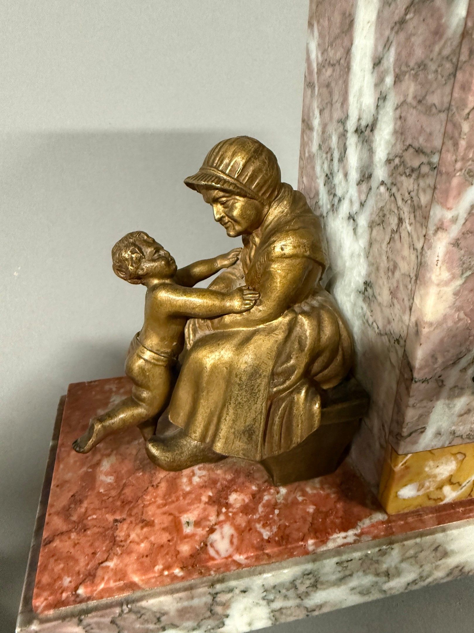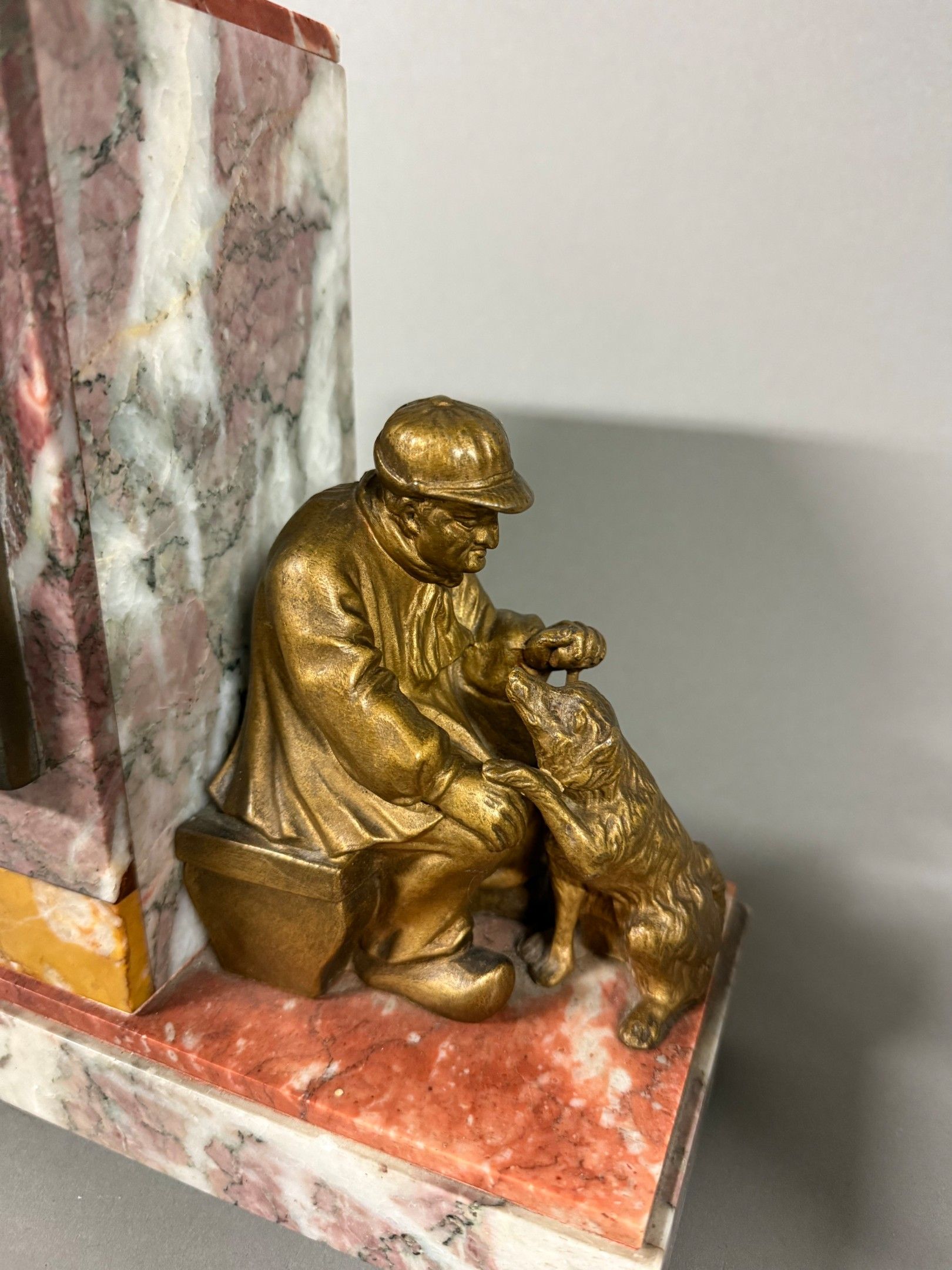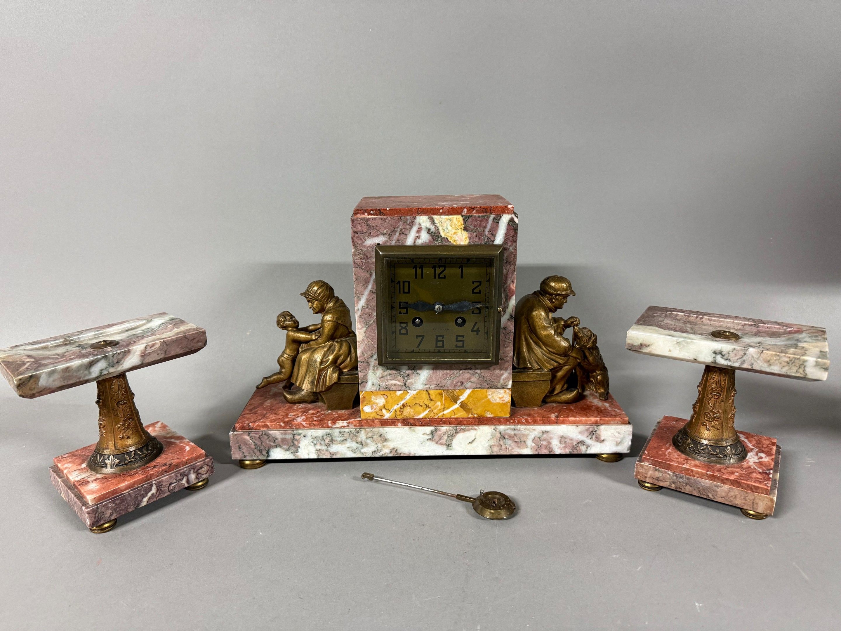 A marble plaque hanged clock with its two cassolettes, the square movement flanked by popular subjects on the theme of Fidelity. Circa 1940. 25 x 37 cm. Chips. Key.