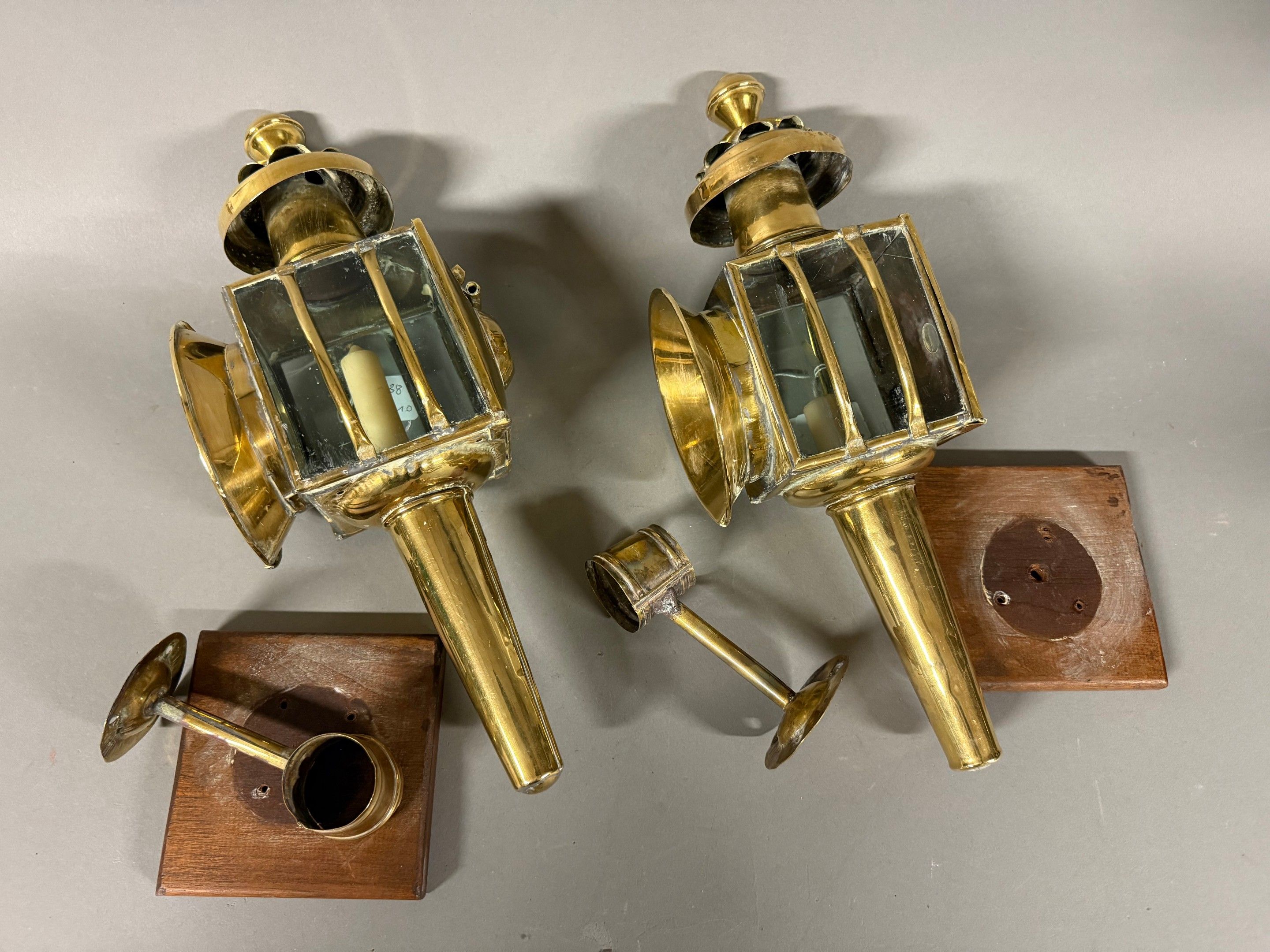 PAIR OF Lanterns for coach or carriage. H. 37 cm. In used condition. With wooden support to be fixed on the wall.