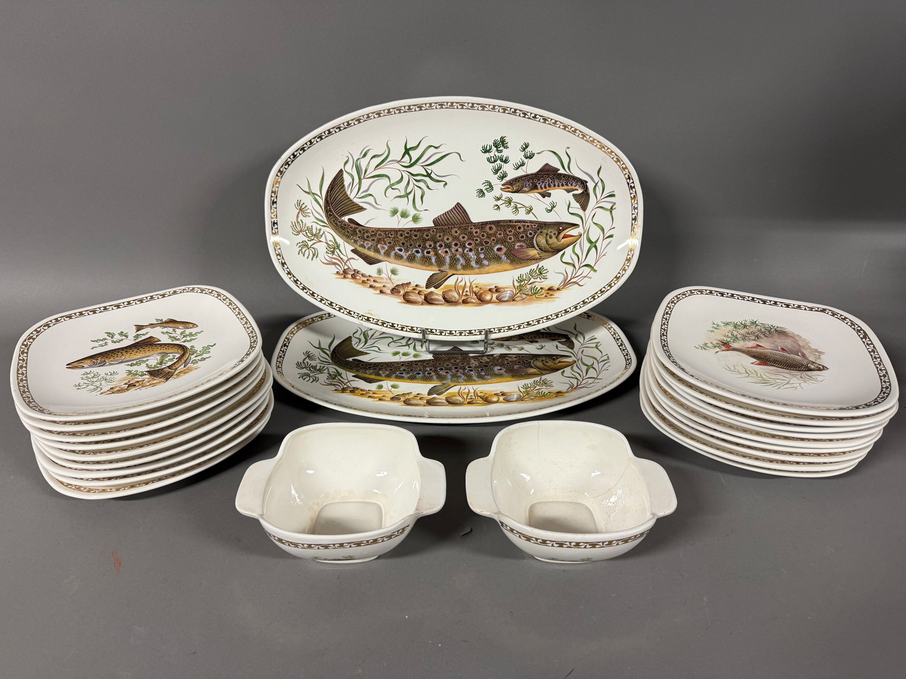 LONGCHAMP. Earthenware fish service comprising two oval dishes, two sauce boats (hair) and 18 plates. Maximum length 43 cm.