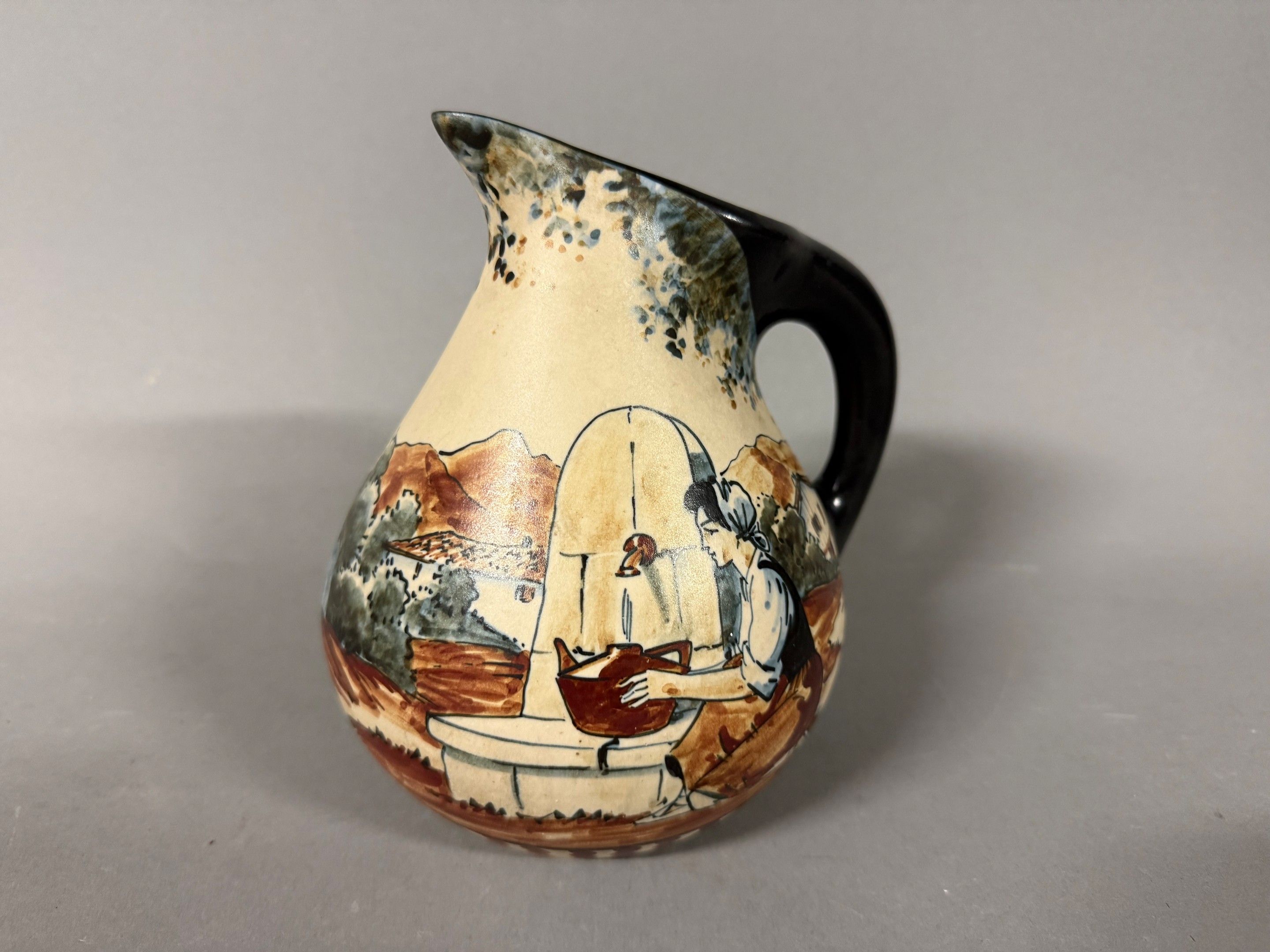 CIBOURE. Enamelled ceramic jug with Basque decoration. Signed on the reverse. Height 18 cm