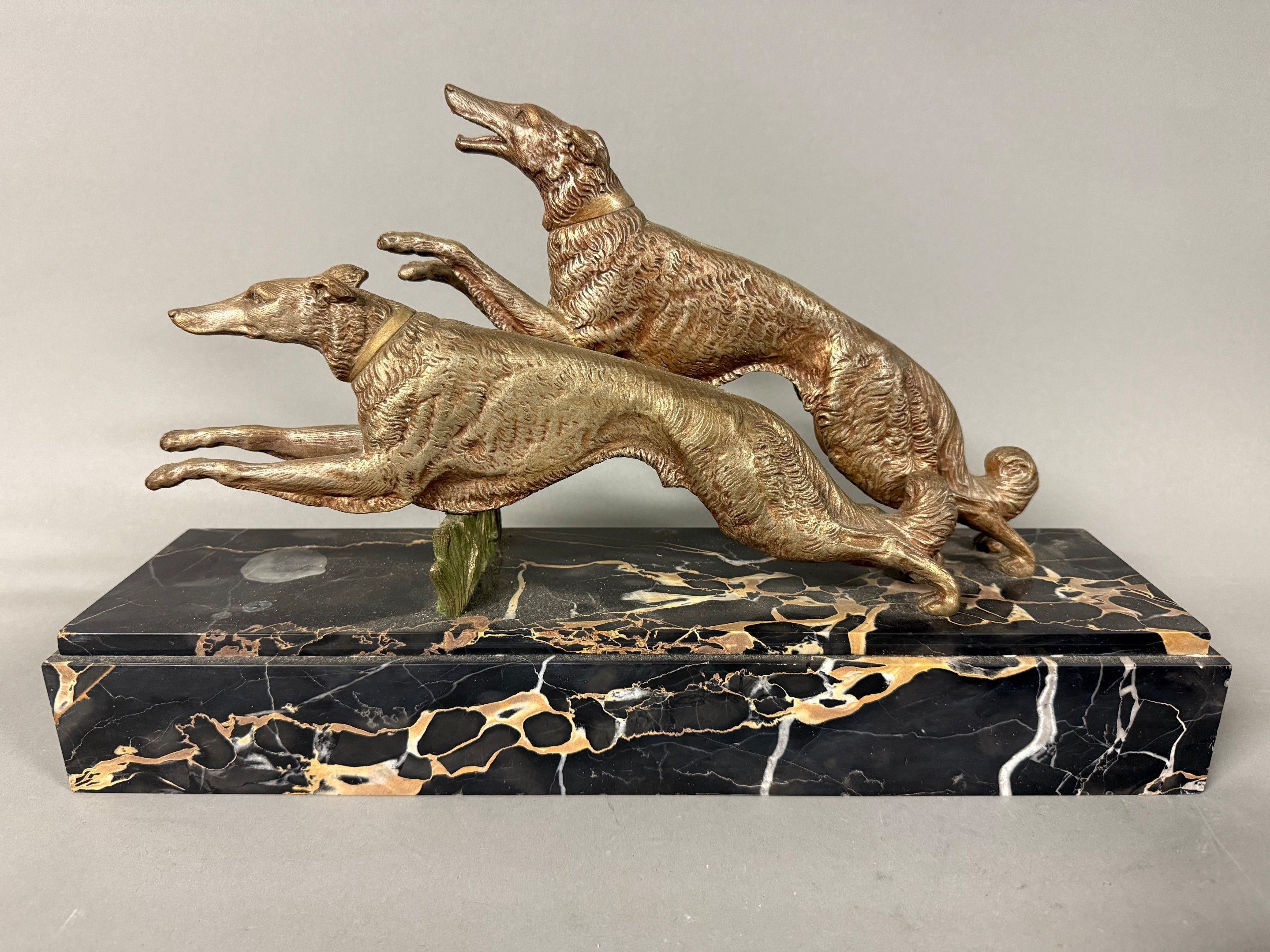 JEAN LORMIER, after. Gilded regule group showing 2 greyhounds in a race. Signed J. Lormier on the collar of unc hien. Marble base. 27.5 x 47 cm.