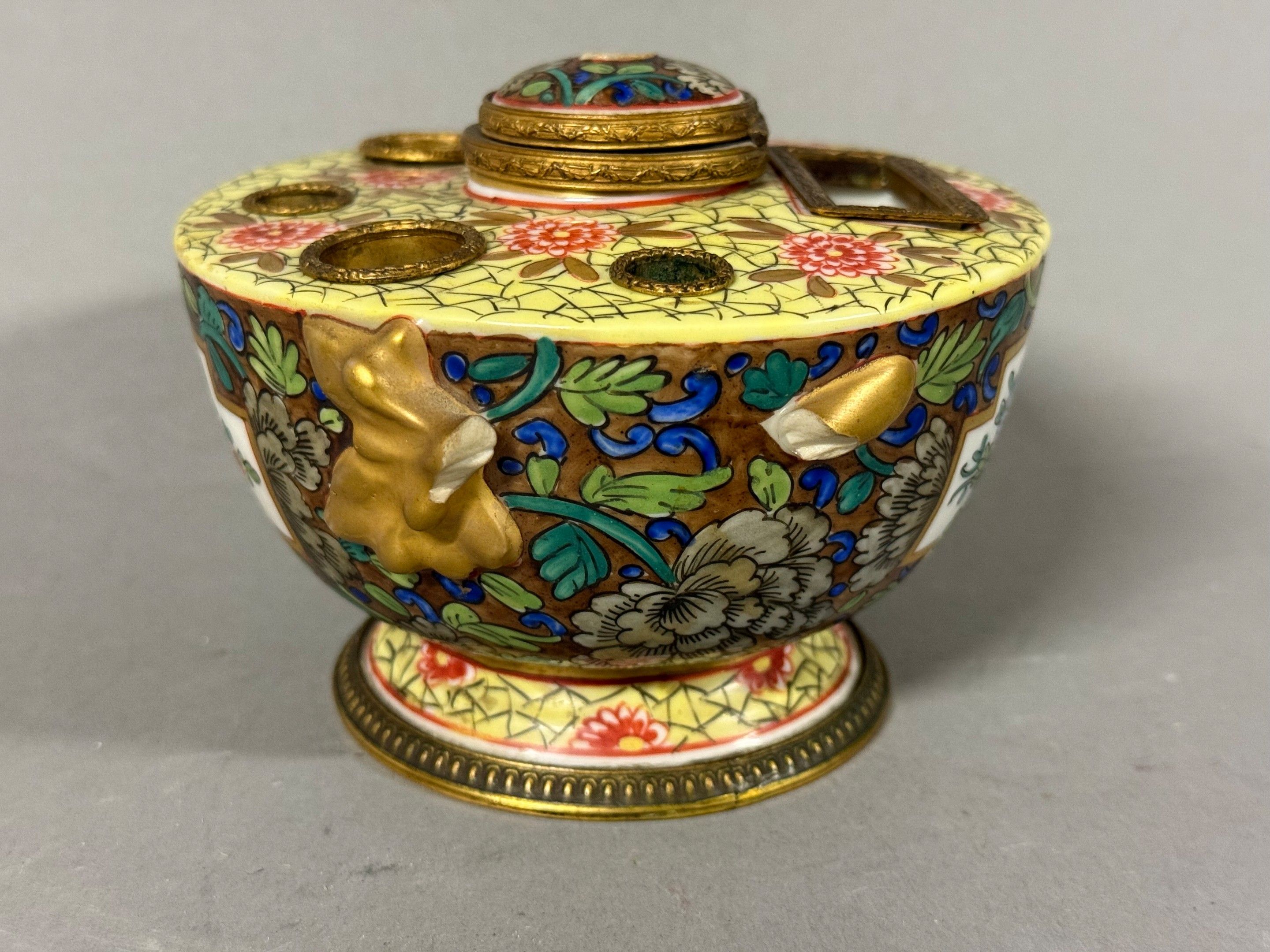 CHINA. Mail set in glazed porcelain. Brass mounting. Mark on the back. Accident. H. 9 cm.