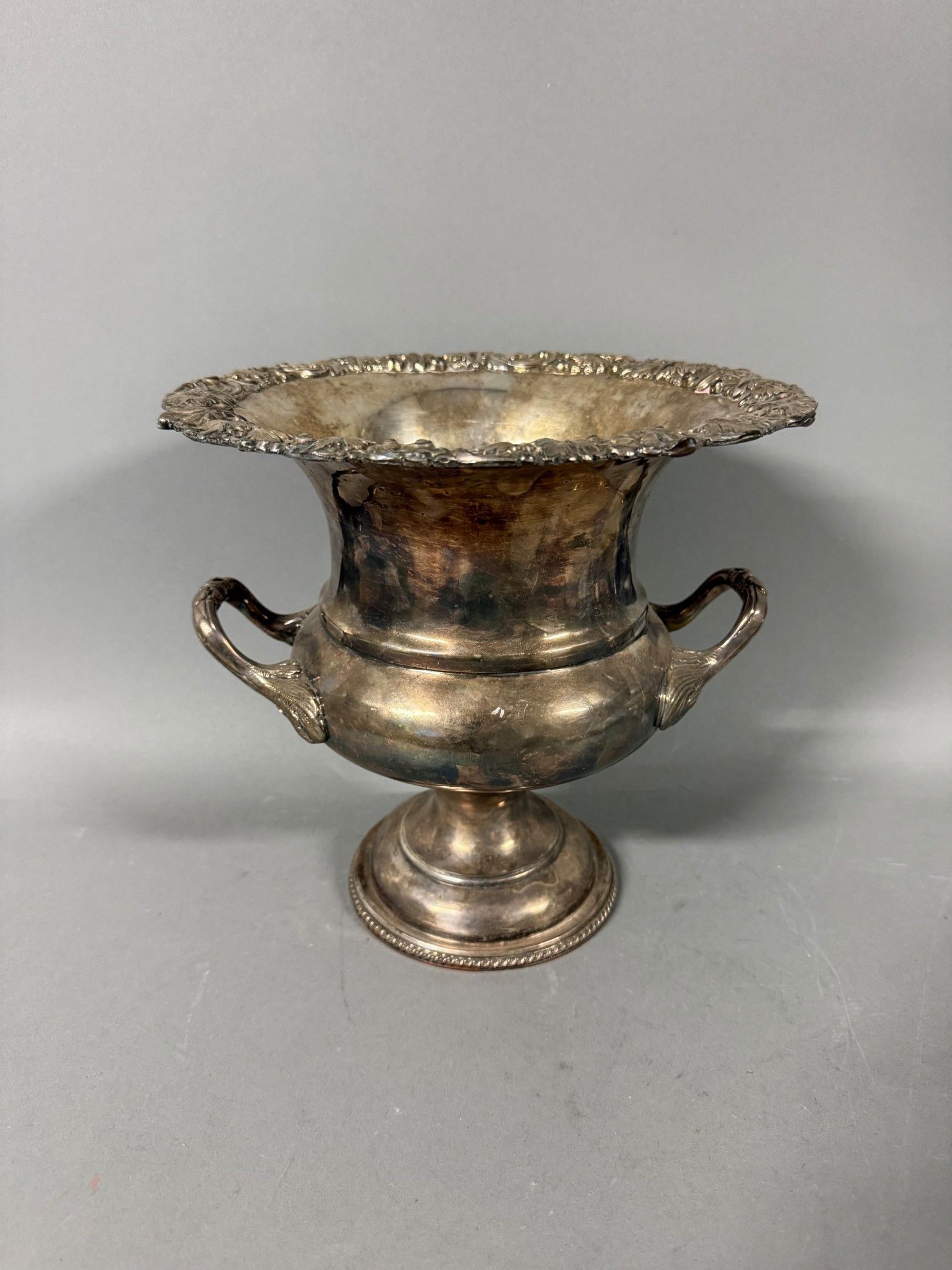 Silver-plated champagne bucket on a pedestal. 2 handles. The rim is decorated with bunches of grapes. 27 x 28 cm. Wear and tear.