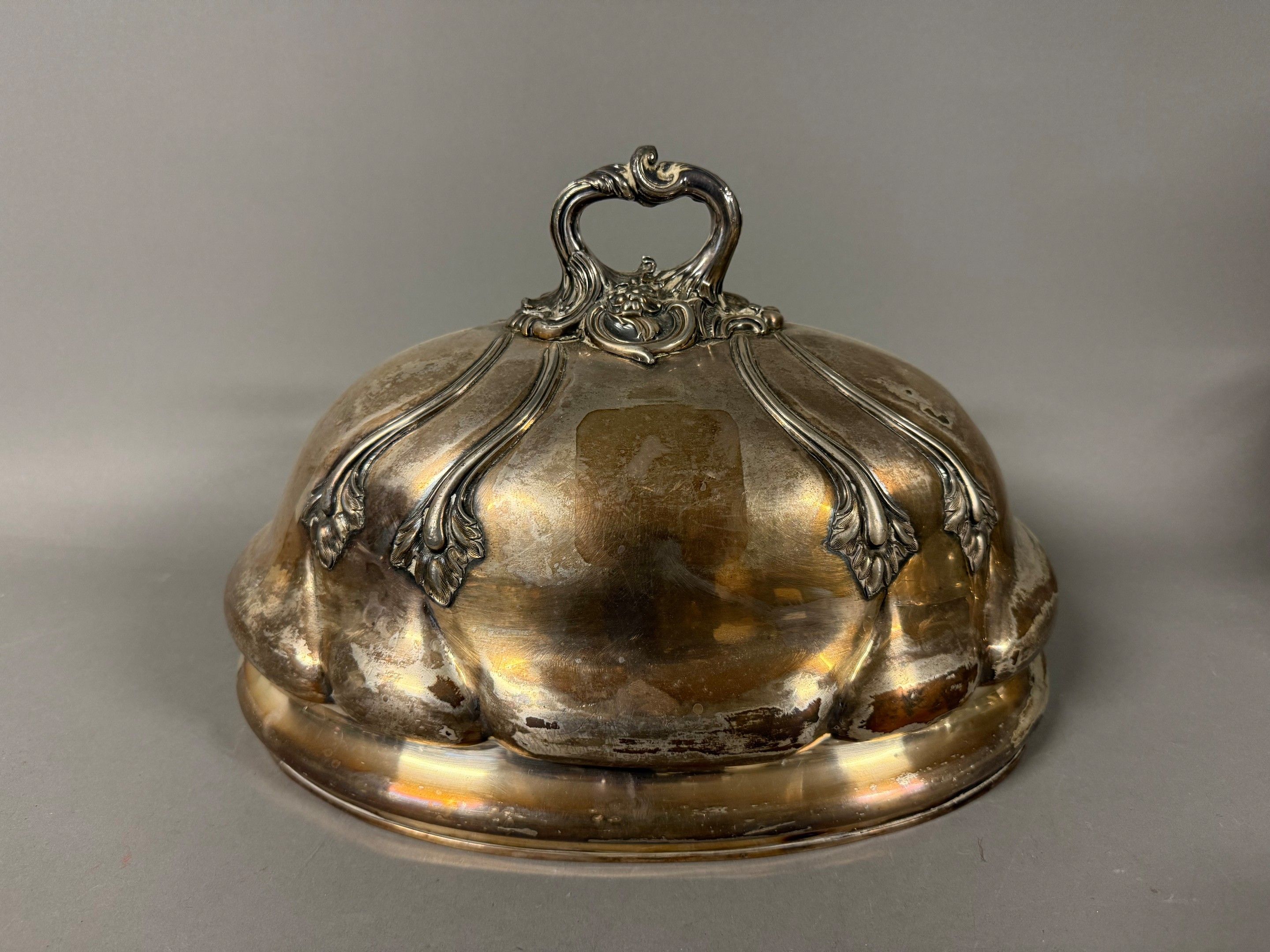 Silver plated CLOCHE with foliage decoration. 26 x 38 x 26 cm. Wear from use.