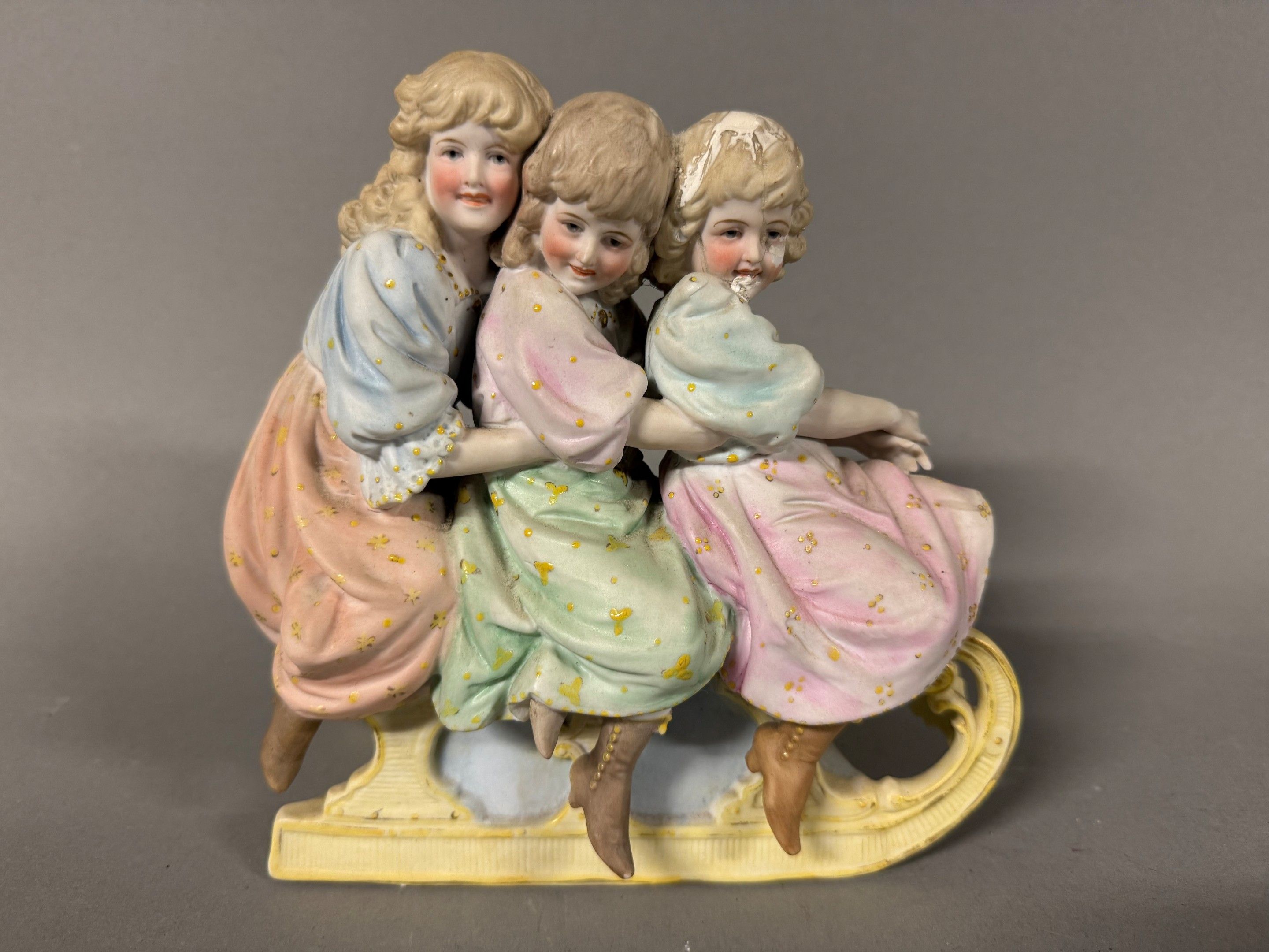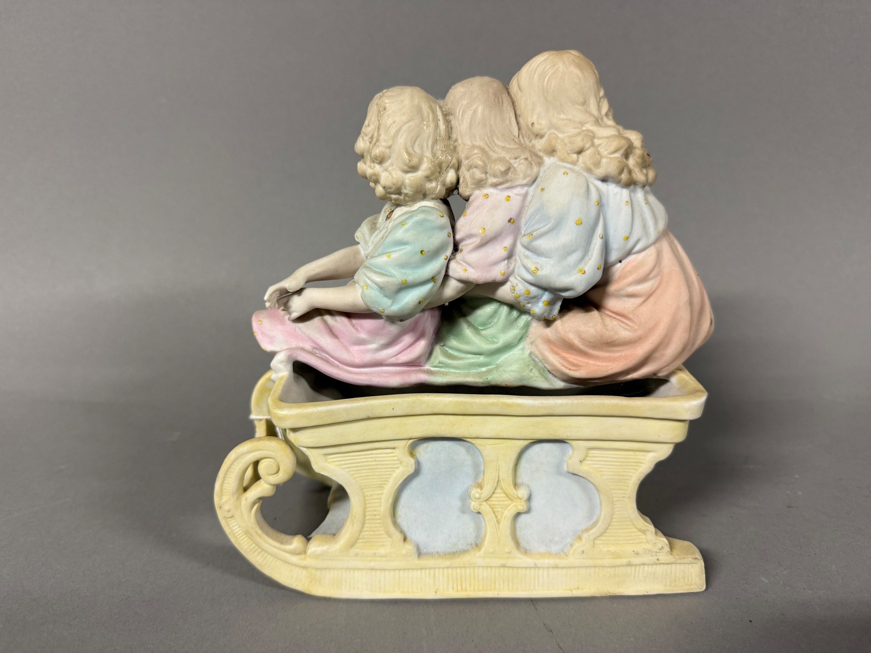 A bisque GROUP of children on a sledge. 19.5 x 17 x 9.5 cm. Restoration damage to hair.