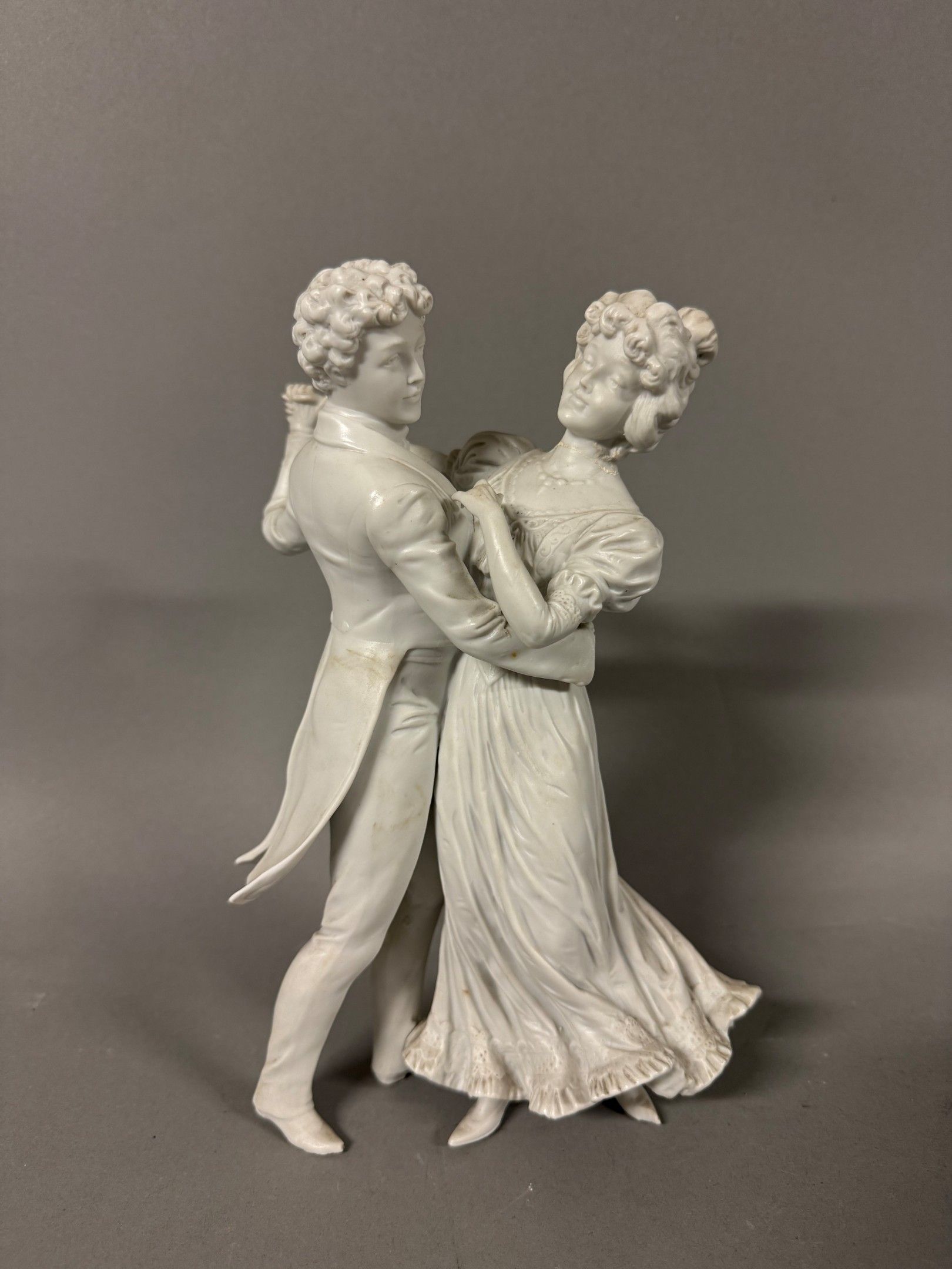 A biscuit group of dancers. 27.5 cm. number 2242. G.G. Head glued back on.