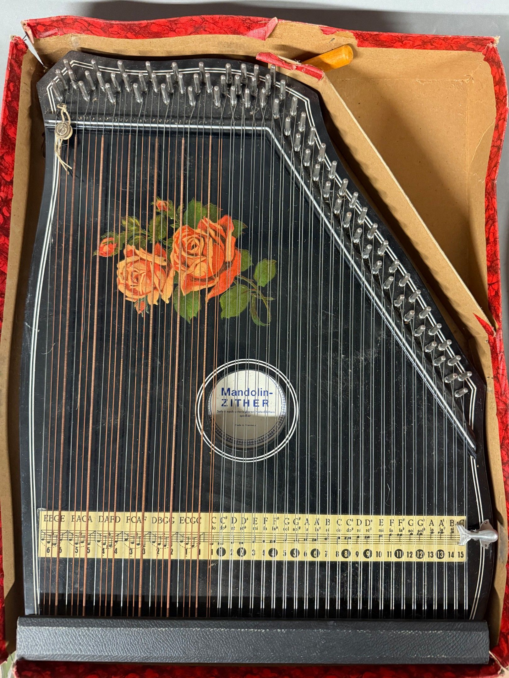 MANDOLIN ZITHER, German table zither, in varnished painted wood, decorated with roses. Box
