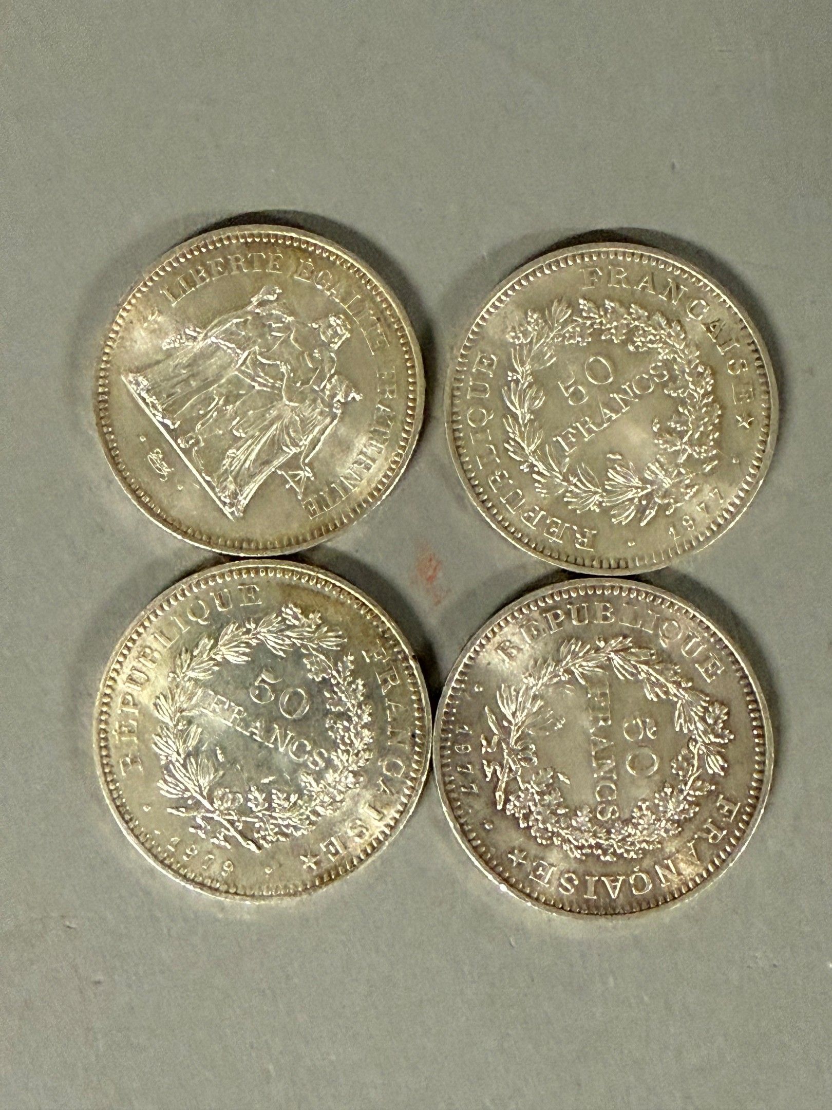 Four 50 Franc Hercule coins (1977, 1977, 1978, 1979).