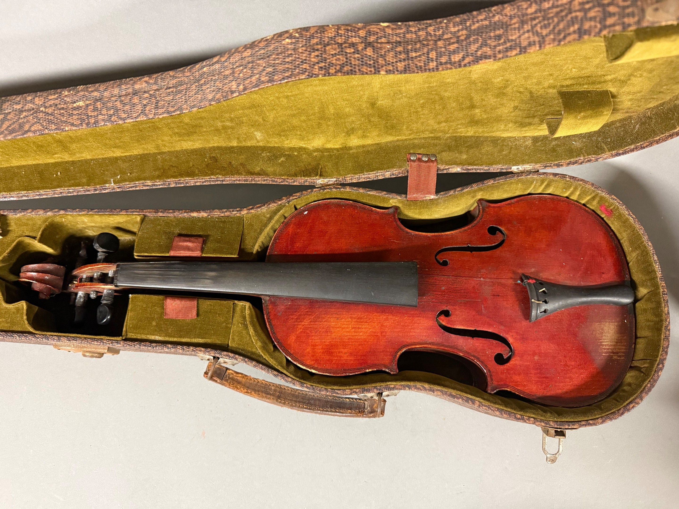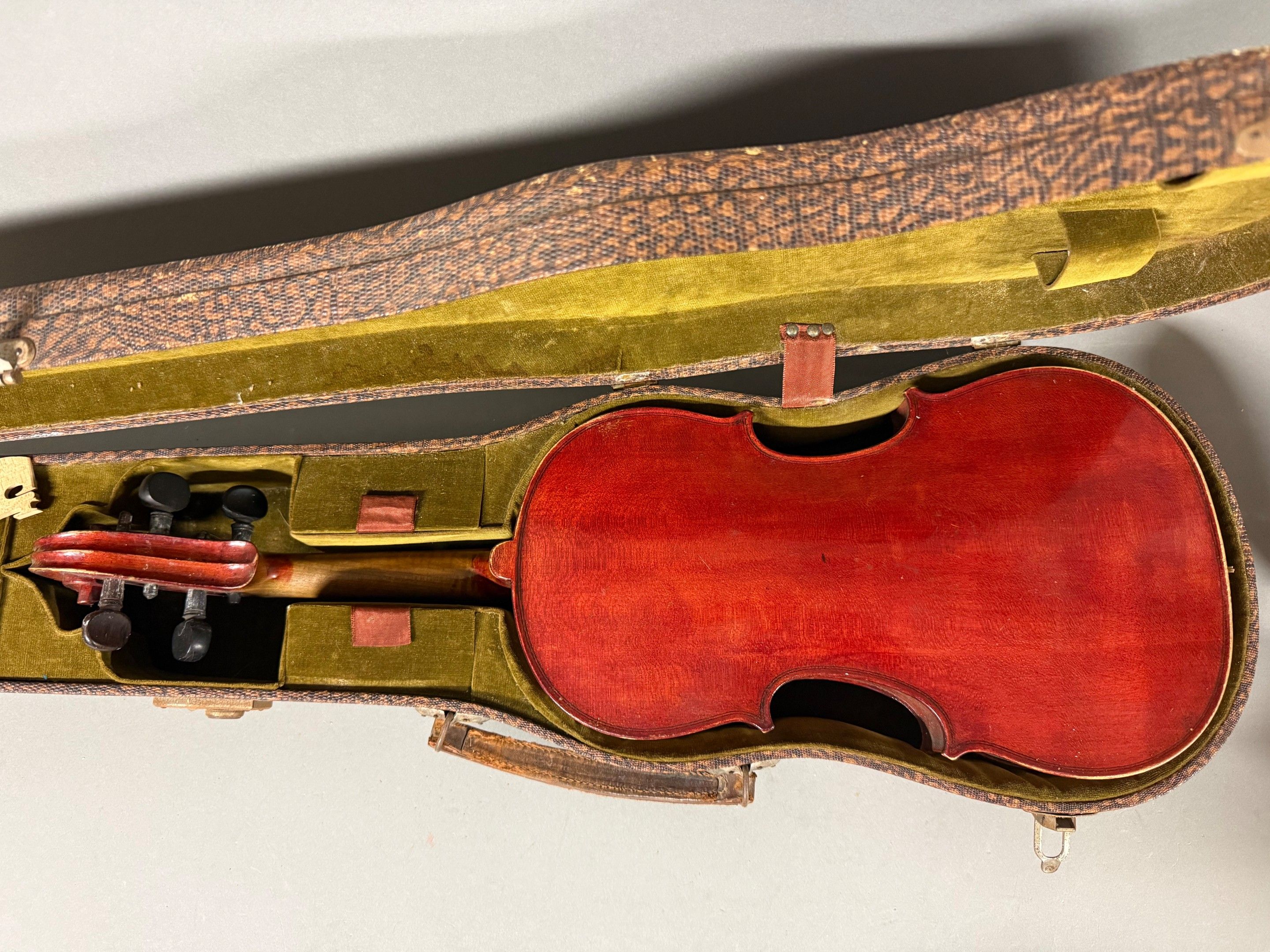 Wooden violin. L. 59 cm. Wear and tear. Case