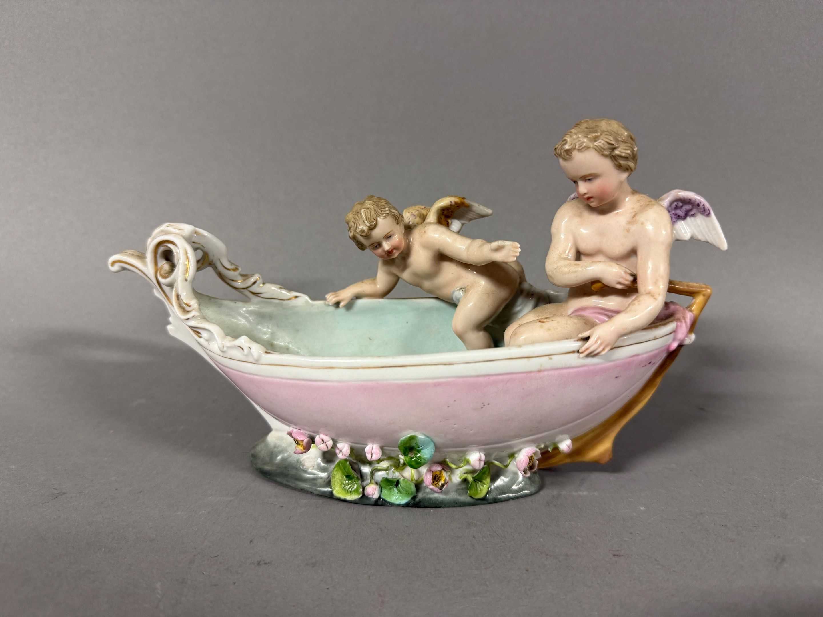 A polychrome enamelled porcelain RINCE-DOIGT with a cherub in a boat. 13.5 x 21.5 cm. Accident restoration.