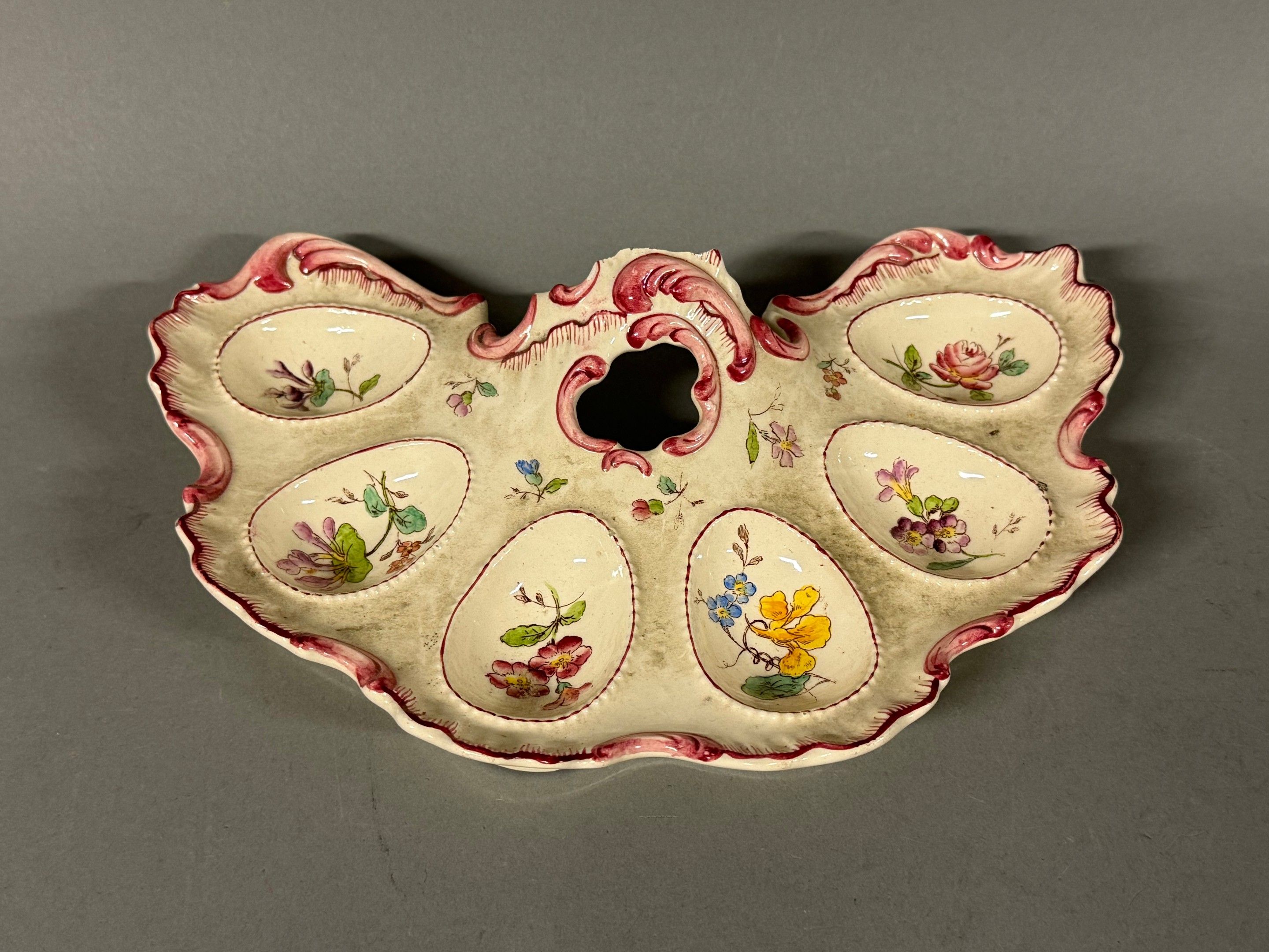 LONGCHAMP, iron earthenware. Polychrome glazed earthenware egg dish. 6 places. Rocaille style.6 x 25 x 17.5 cm.