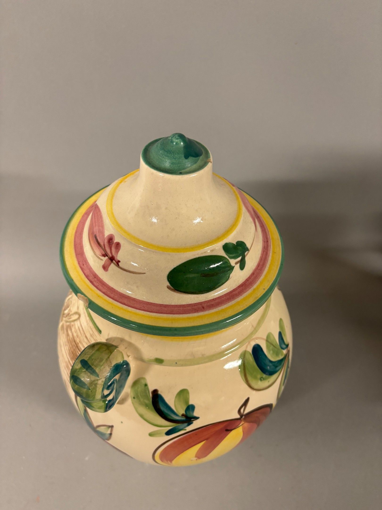 Polychrome glazed earthenware COVERED POT "Rumtopf" W. Germany. h 35.5 cm. chips.