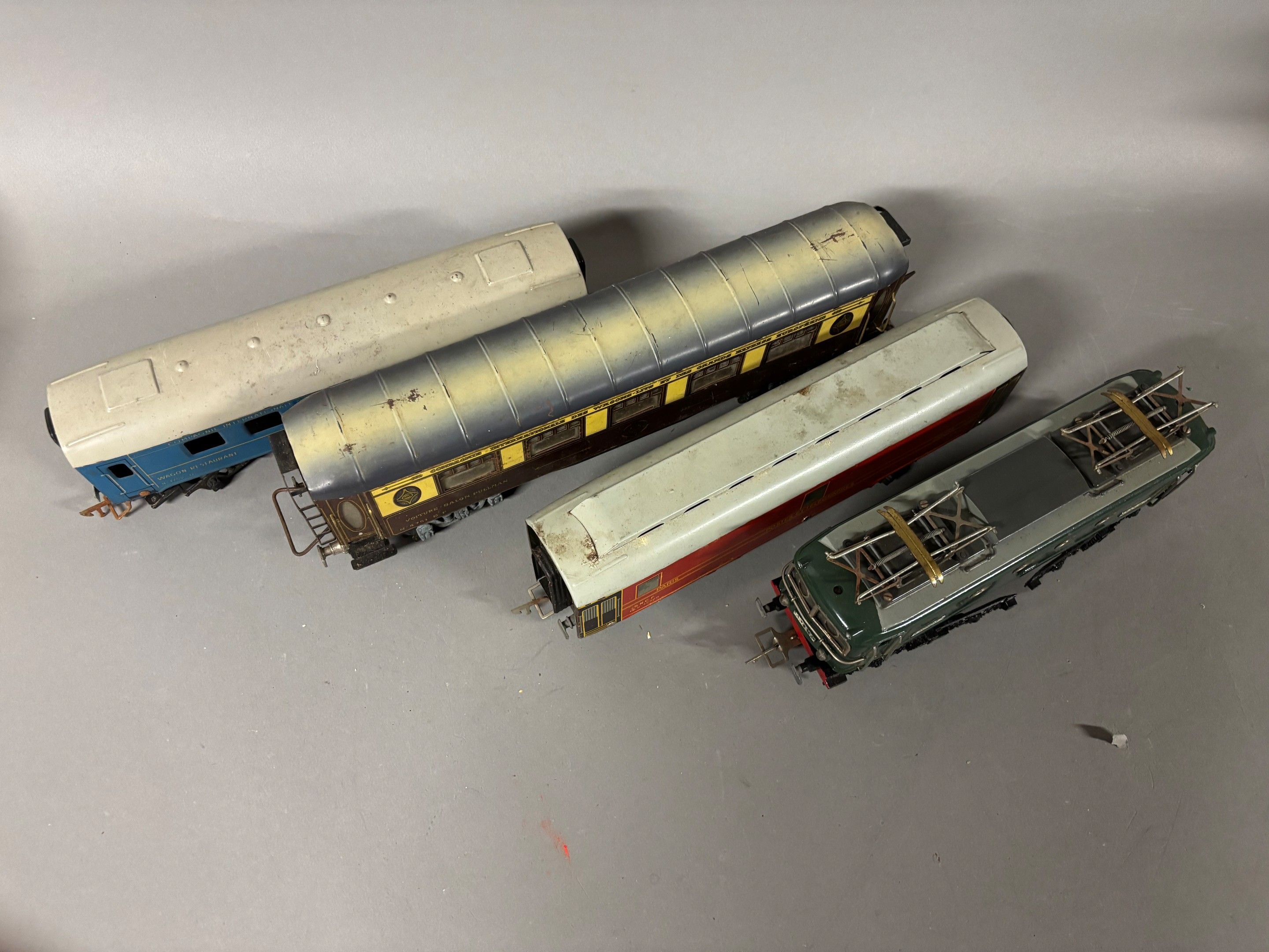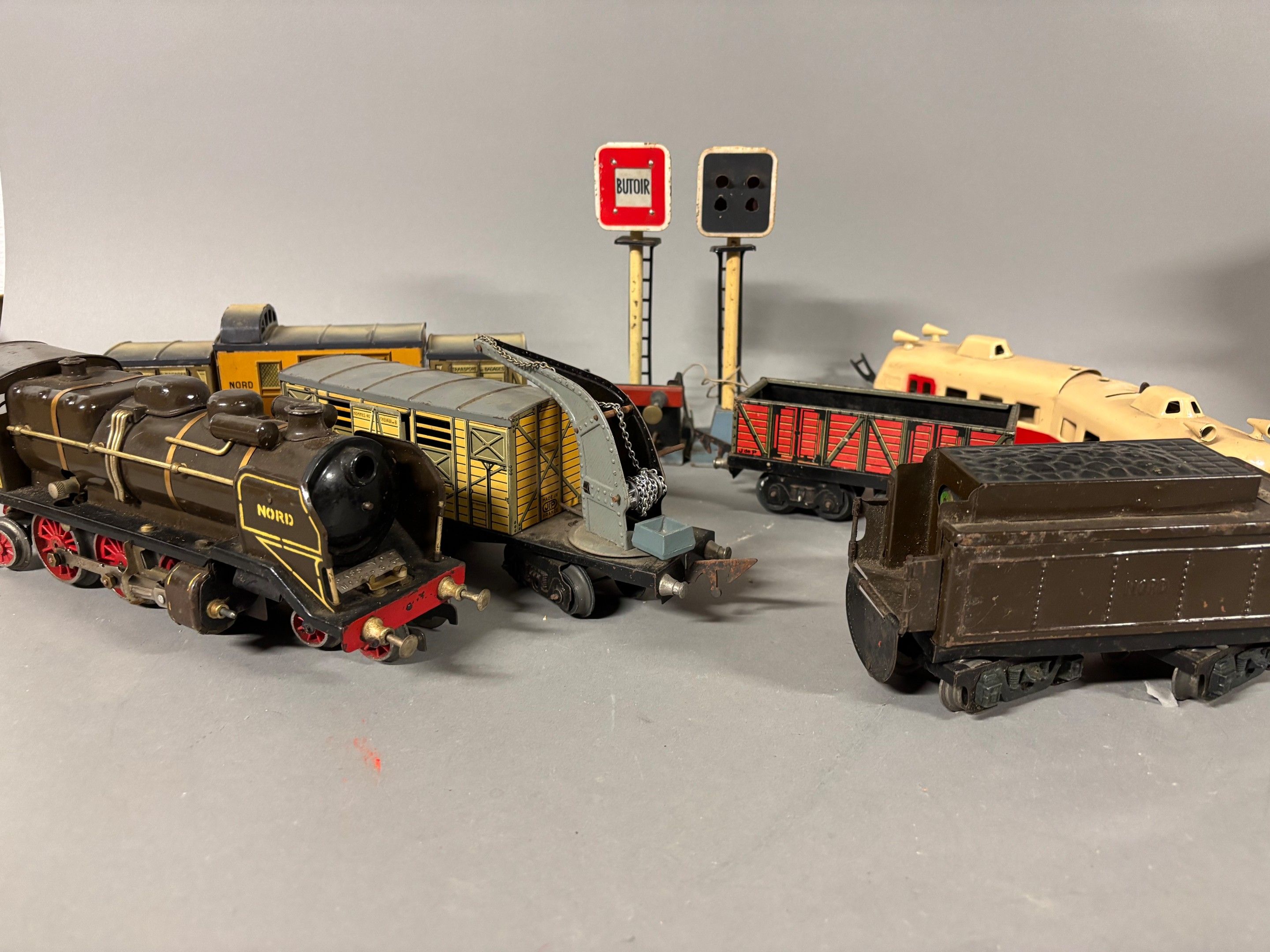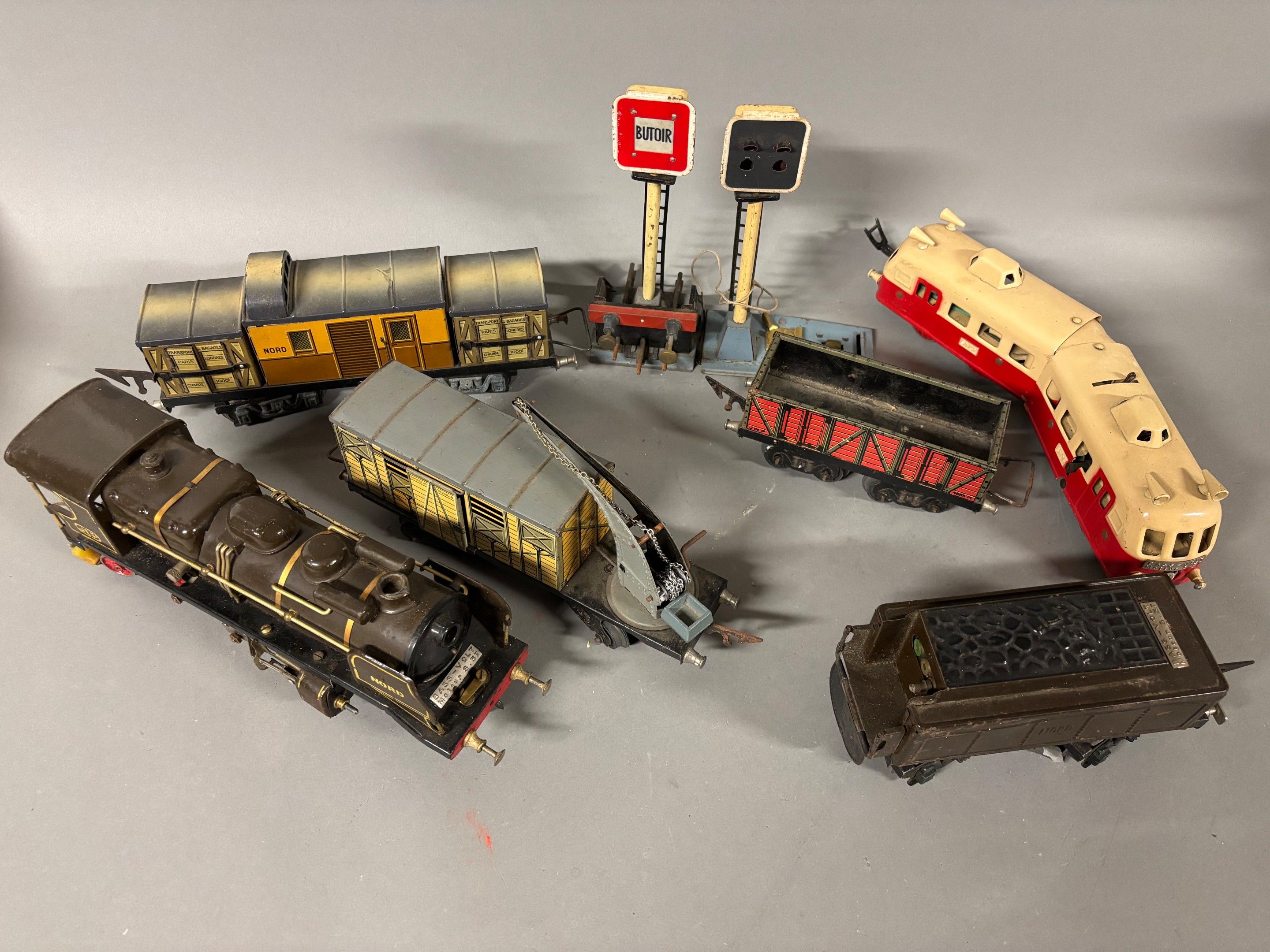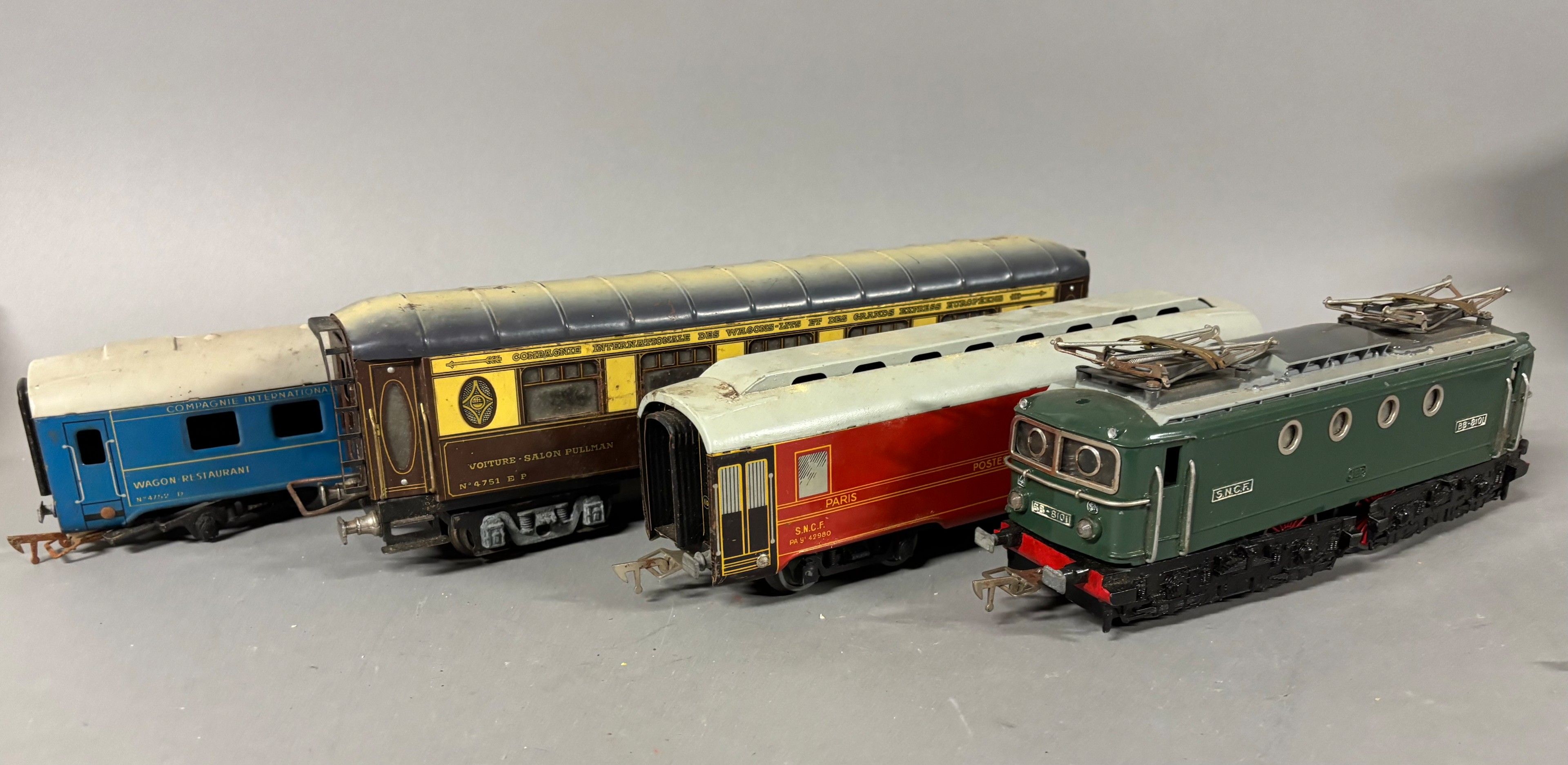 JEP, France. Lithographed sheet metal train, including: Locomotive (electric, cables) - Coal Tender (Bass-volt engine S.57) - Pullman lounge car no. 4751EP - BB8101 car, (AP5 engine, no. B,414055, series 60) - restaurant car, compagnie internationale des wagons lits et des grands express européens, no. 04752 D - Postes et télégraphes Paris Tours, SNCF PA y 42980 - SNCF articulated wagon - Paris London baggage car, load 1000 t - cattle car and winch - 4685 M open car - buffer block.