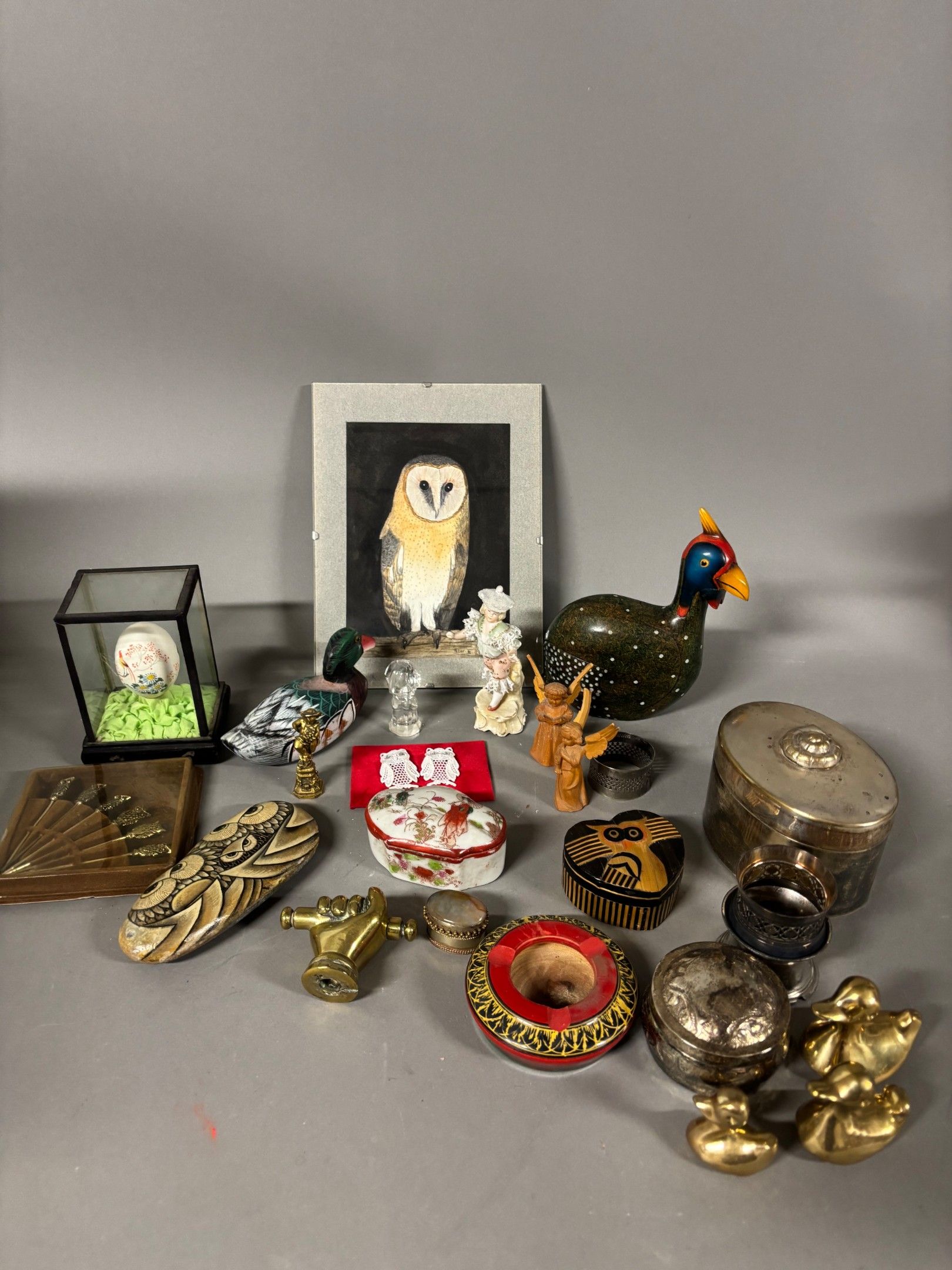 LOT of curios, including: boxes, pillboxes, ashtray, painted egg under glass, etc.